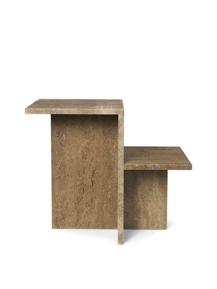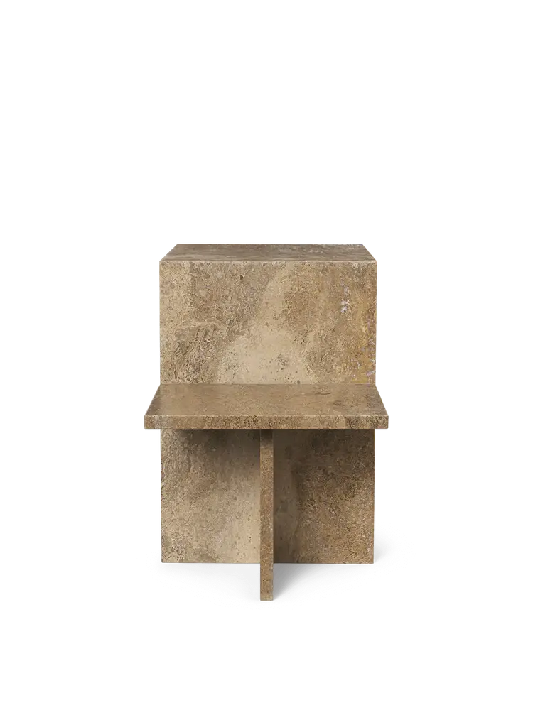 Ursprünglich vom japanischen Minimalismus inspiriert, erforscht der Distinct-Beistelltisch die Schaffung komplexer Strukturen, die auf einem einzigen Element basieren. Die minimalistische Konstruktion bildet einen Kontrast zur Fülle der erdigen Travertin-Texturen. Die natürlichen und vielfältigen Eigenschaften des Kalksteins sorgen für einen rauen Touch und Griffigkeit, was den architektonischen Charakter des Möbelstücks unterstreicht.