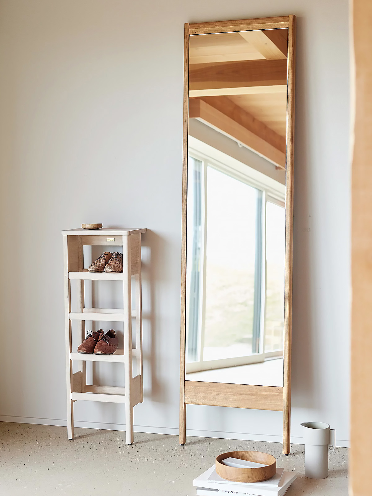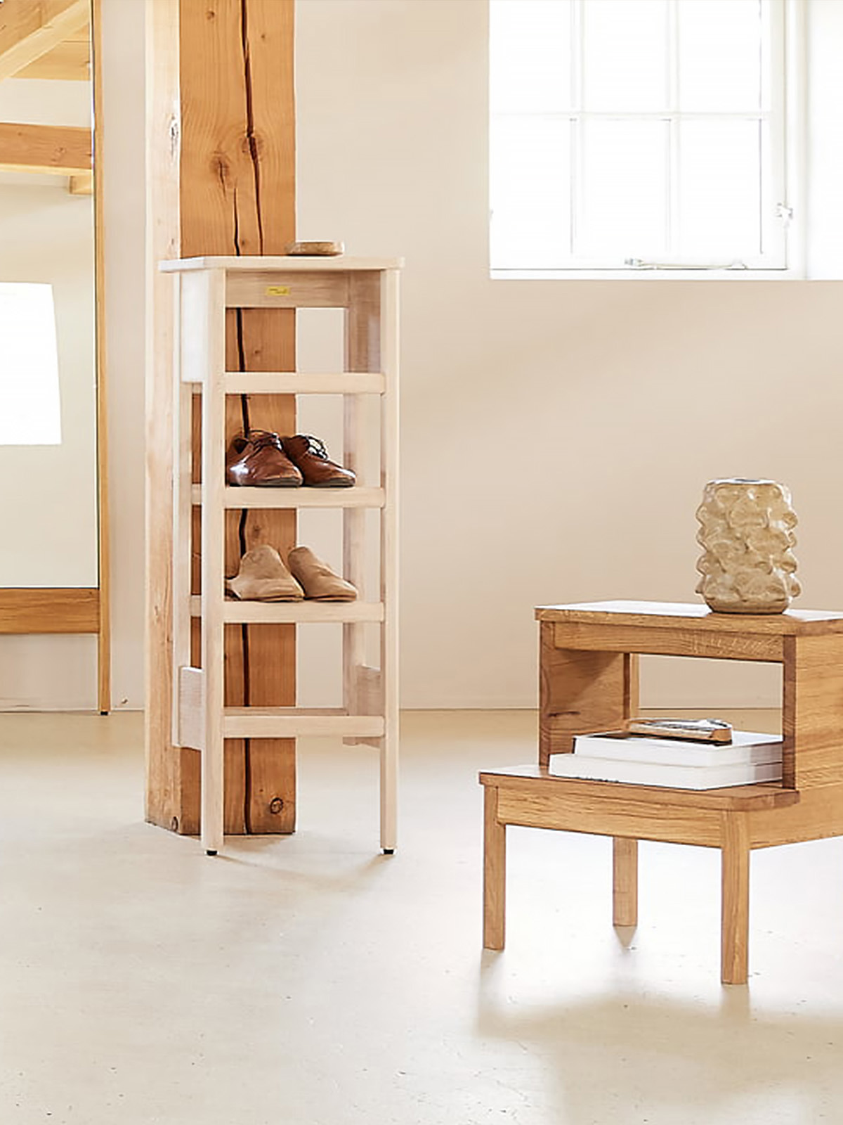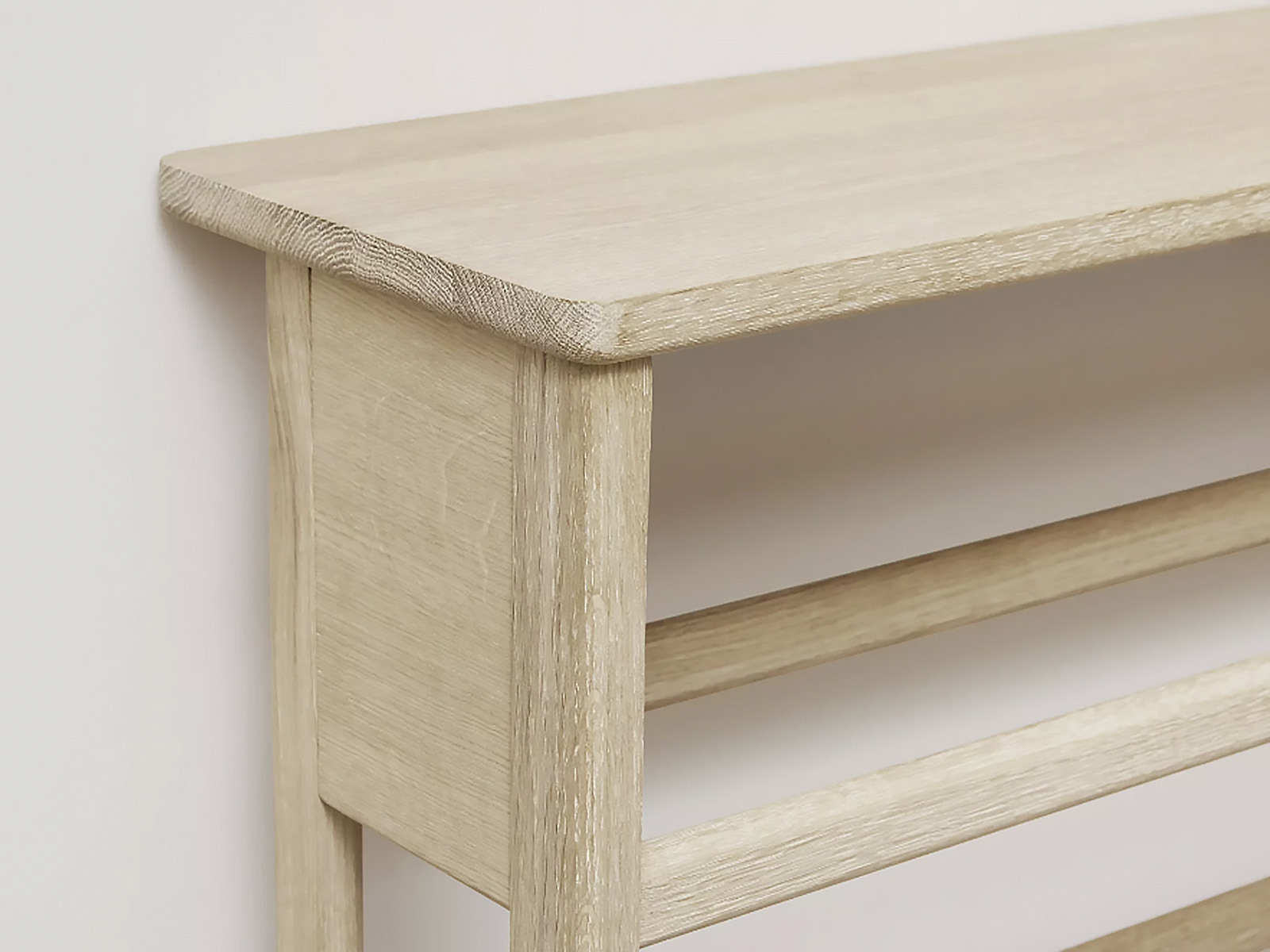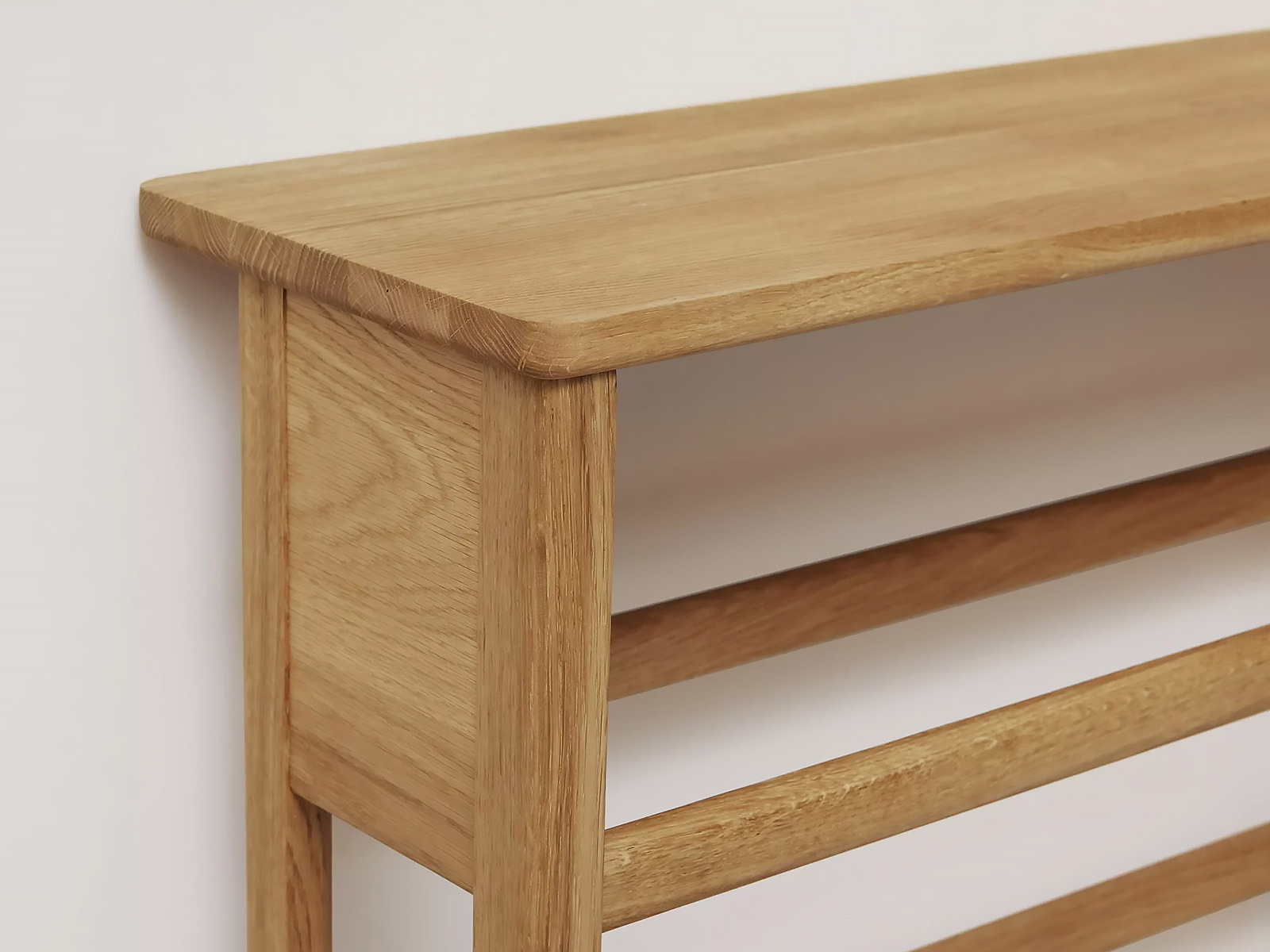 Das A Line Shoe Rack in harmonischem Design ist eine Kombination aus Schuhregal und Ablage für schmale Flure, den Haushaltsraum oder den abgetrennten Eingangsbereich. Das Regal ist aus nachhaltiger Eiche von höchster Qualität. Die Kanten sind fachmännisch abgerundet, und die etwas größere Fläche oben am Schuhregal dient als Ablage.