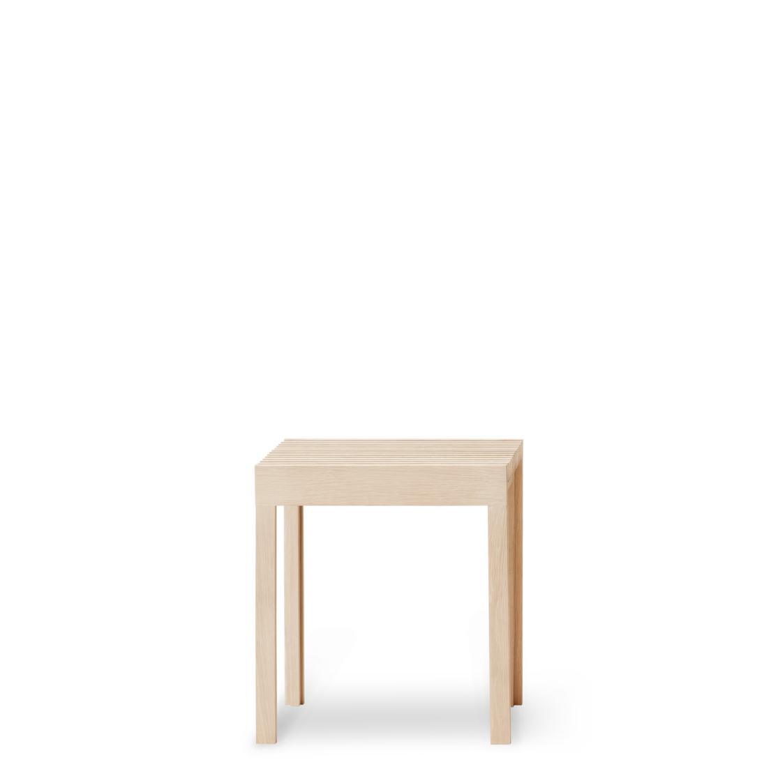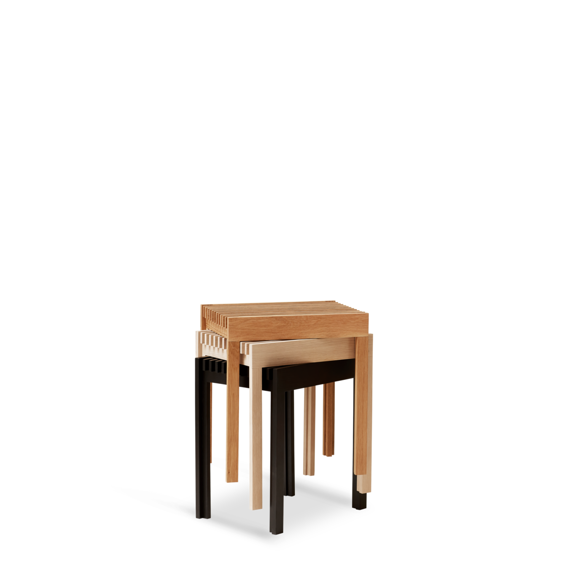 Ein sehr vielseitiger und ultraleichter Hocker, der als zusätzliche Sitzgelegenheit verwendet werden kann, als elegantes Design-Objekt oder als Beistelltisch. Obwohl er sehr leicht ist, wurde bei der Qualität keinerlei Kompromiss eingegangen – der Hocker ist ausgesprochen stabil und robust. Das Möbelstück präsentiert sich als detaillierte Holzarbeit mit einer minimalistischen Aneinanderreihung von Holzlatten.