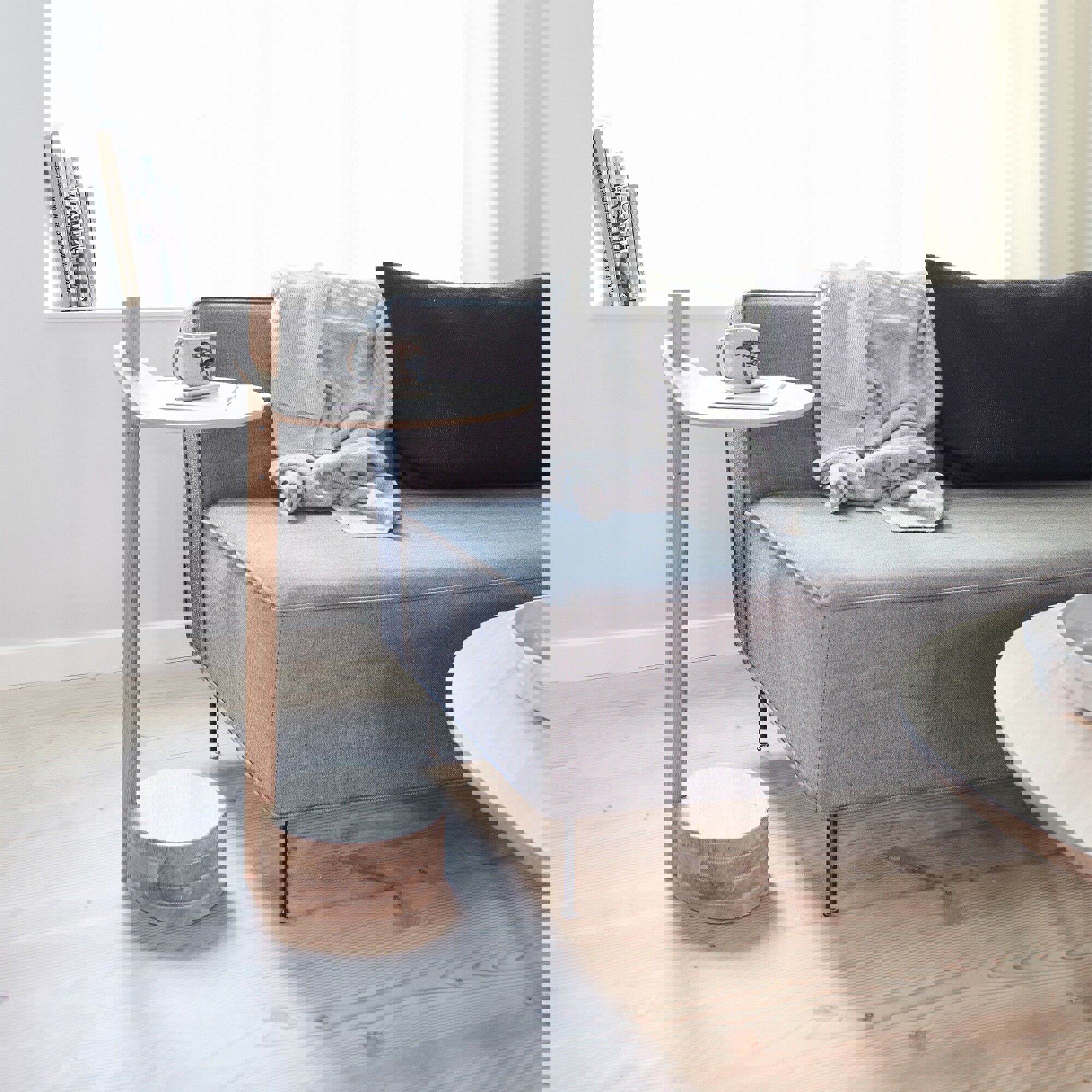 Ein beweglicher und vielseitiger Beistelltisch. Der Tisch ist optisch sehr leicht, da die Tischplatte lediglich an einem Bein befestigt ist und somit in der Luft zu schweben scheint.