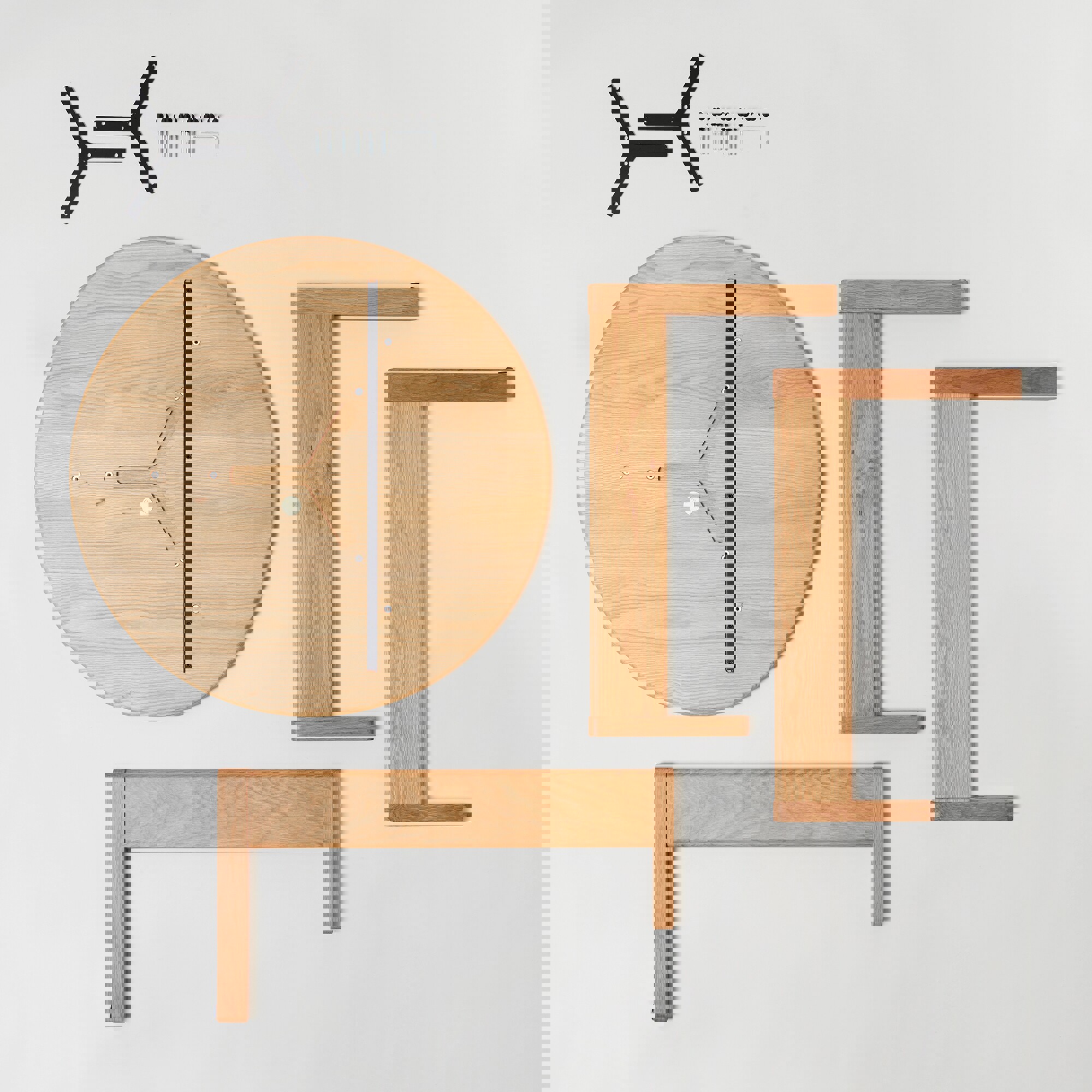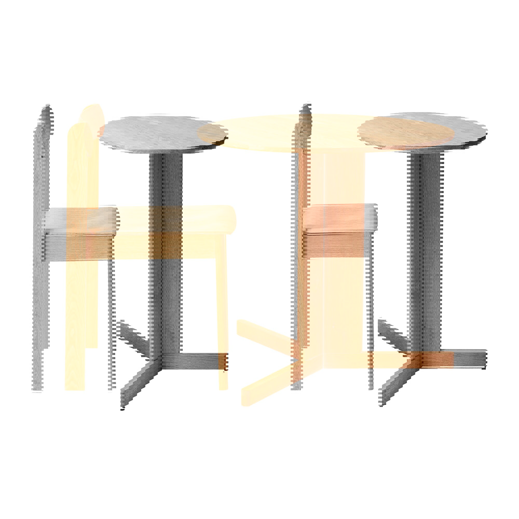 Drei solide, auf ein Zentrum ausgerichtete Eichenelemente bilden das Fundament für diesen Rundtisch und erzeugen einen Widerspruch aus Leichtigkeit und Dichte. Der freie Platz zwischen den drei Tischbeinen unterstreicht den Eindruck von Leichtigkeit und die besondere optische Komplexität des Möbelstücks.