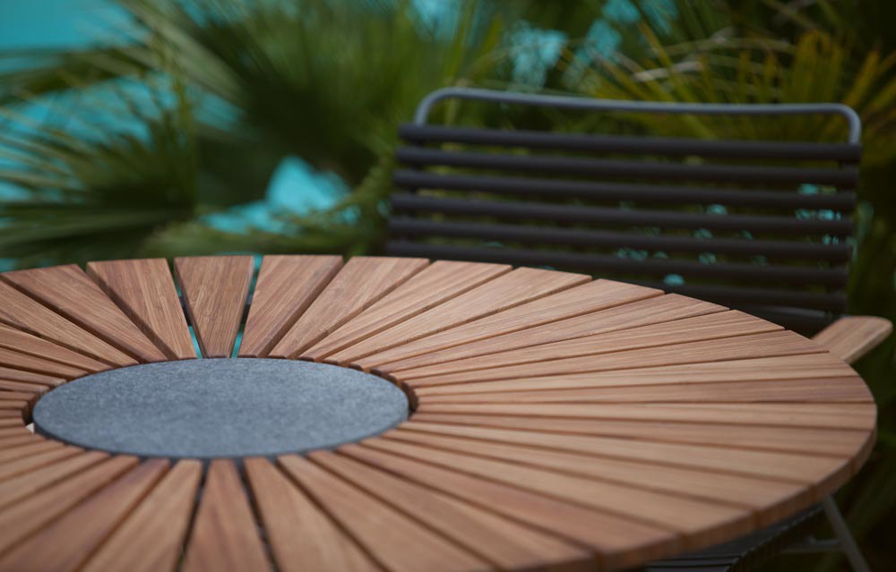 CIRCLE Esstisch, Ø110 mit Tischplatte aus Bambuslamellen und Beinkonstruktion aus grau pulverbeschichtetem Aluminium. Ein schöner und gut proportionierter Esstisch für Ihren Garten, der freies Sitzen ermöglicht, da die Beinkonstruktion unter den Tisch gezogen ist, um viel Beinfreiheit zu bieten. CIRCLE Ø110 bietet bequem Platz für 6 Personen um den Tisch herum. Dekorativer Granitstein in der Tischmitte für heiße Töpfe. Die Bambus-Tischplatte ist vorgeölt.