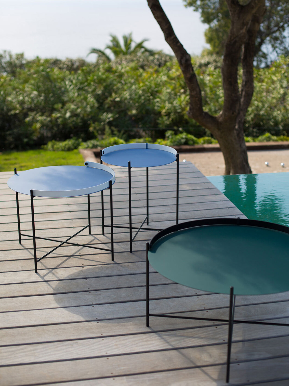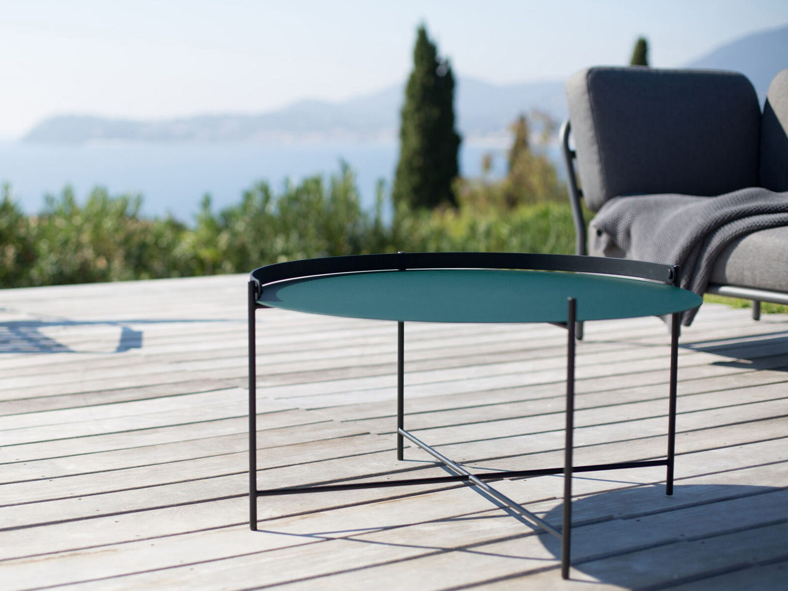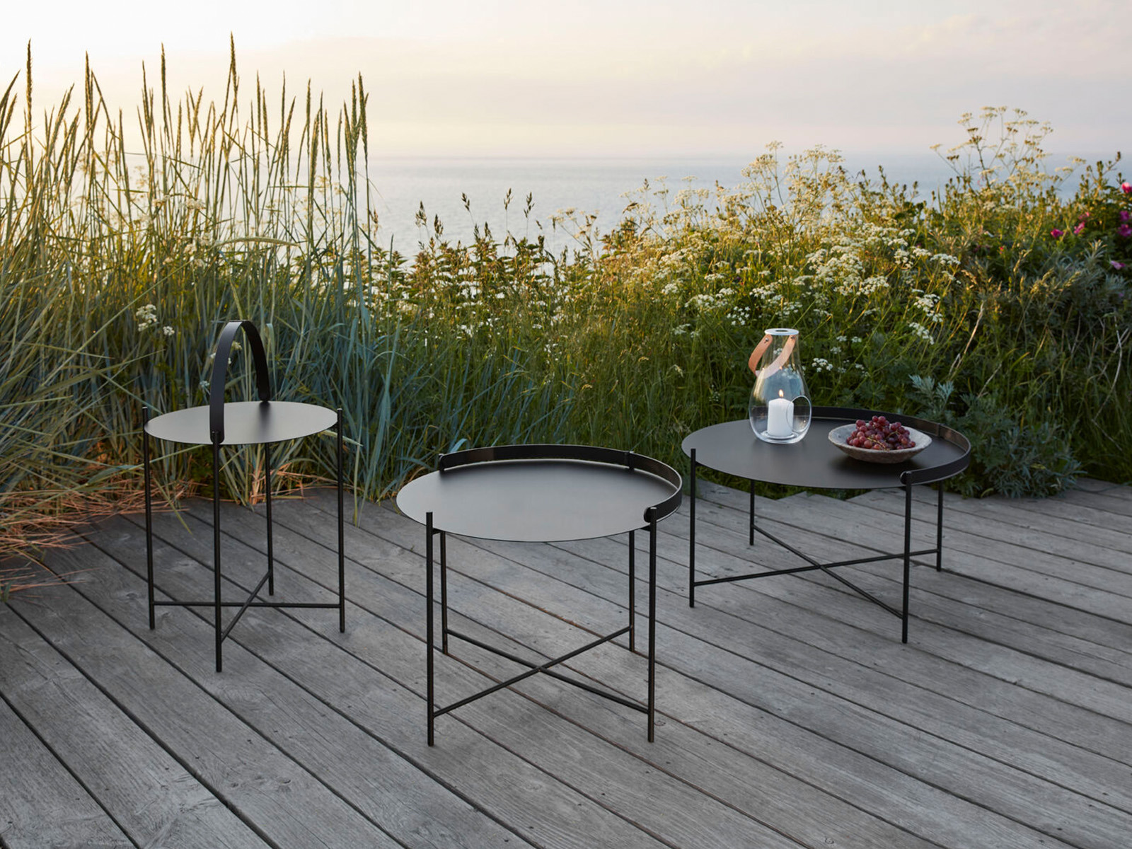 EDGE Tabletttisch. Der halbrunde Griff erleichtert das Verschieben des Tisches zwischen Wohnzimmer und Garten, und wenn er abgelegt wird, fungiert er als Tischkante, der sicherstellt, dass alles an seinem Platz bleibt.