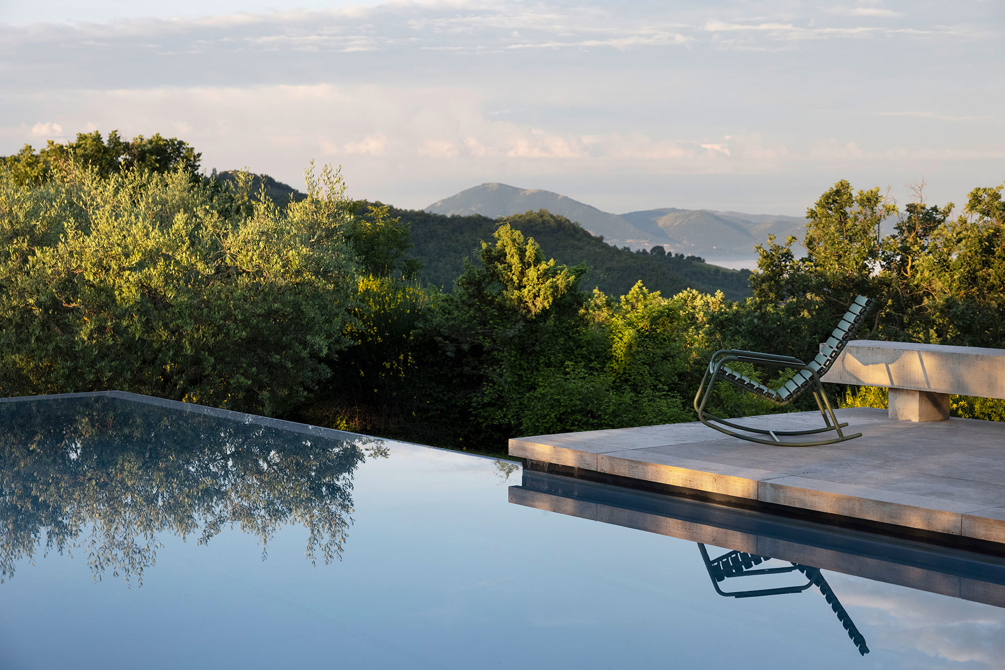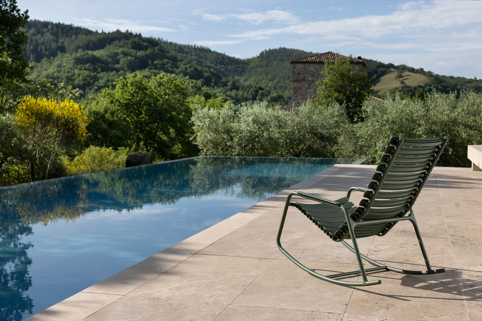 ReCLIPS Schaukelstuhl mit Aluminium-Armlehnen. Der ReCLIPS Schaukelstuhl ist in 4 monochromen Farben erhältlich. ReCLIPS ist Teil von HOUE MyTrash. Es handelt sich um eine Kollektion von Gartenstühlen mit breiten Lamellen, die aus 97% dänischem Haushaltsplastikmüll hergestellt und in Dänemark produziert werden. Mit ReCLIPS betrachten Sie im Grunde das Ergebnis der Vermischung von dänischem Design und dänischer Innovation - und die Umwandlung dieses neuen Denkens und Materials in einen Stuhl. Der Aluminiumrahmen und die UV-geschützten Kunststofflamellen halten den Wartungsaufwand minimal.