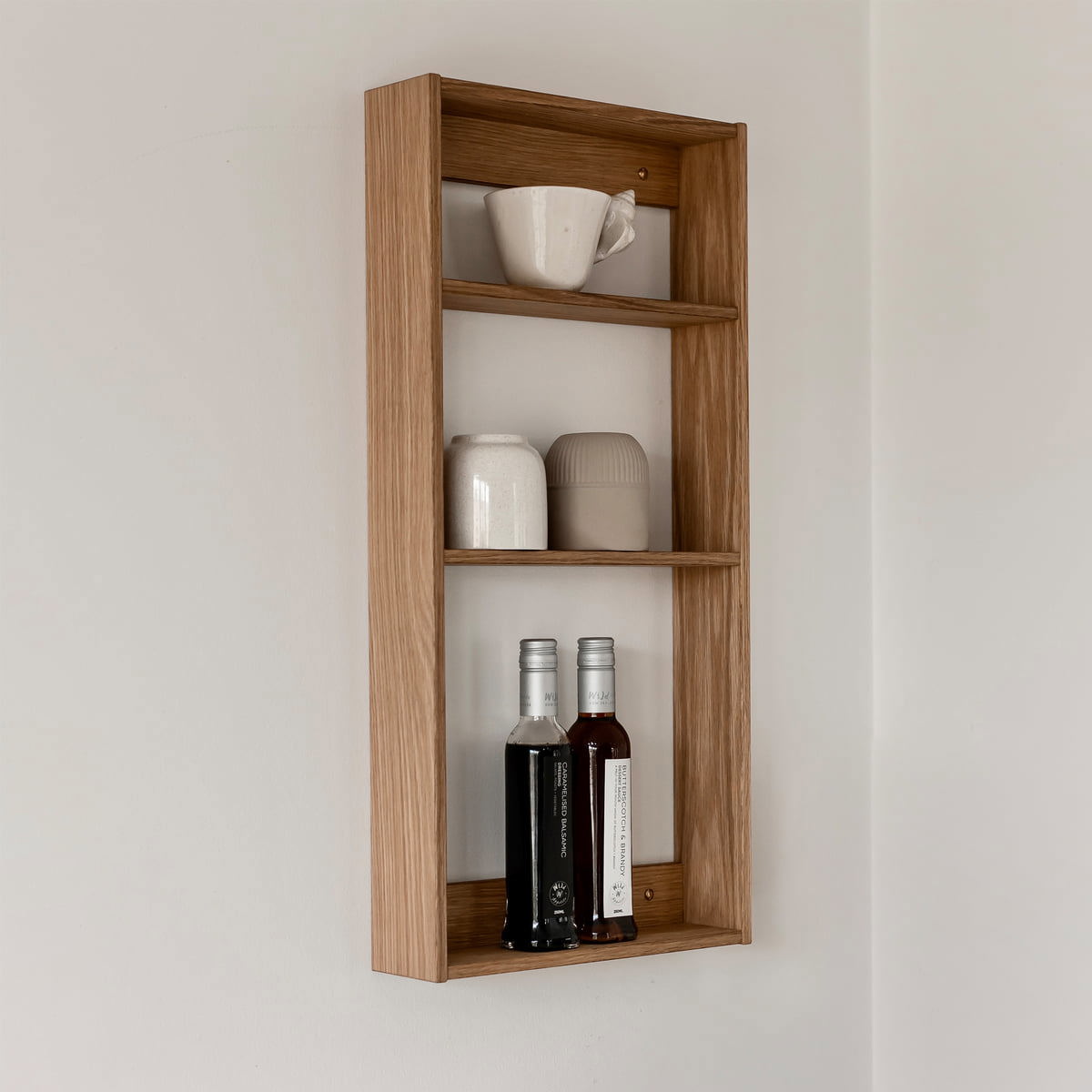 Threesquare ist ein sehr schlankes, an der Wand montiertes Regal, das Ihnen hilft, Ihre Gegenstände in jedem Raum zu organisieren und alles ordentlich in fünf Quadraten einzufassen.