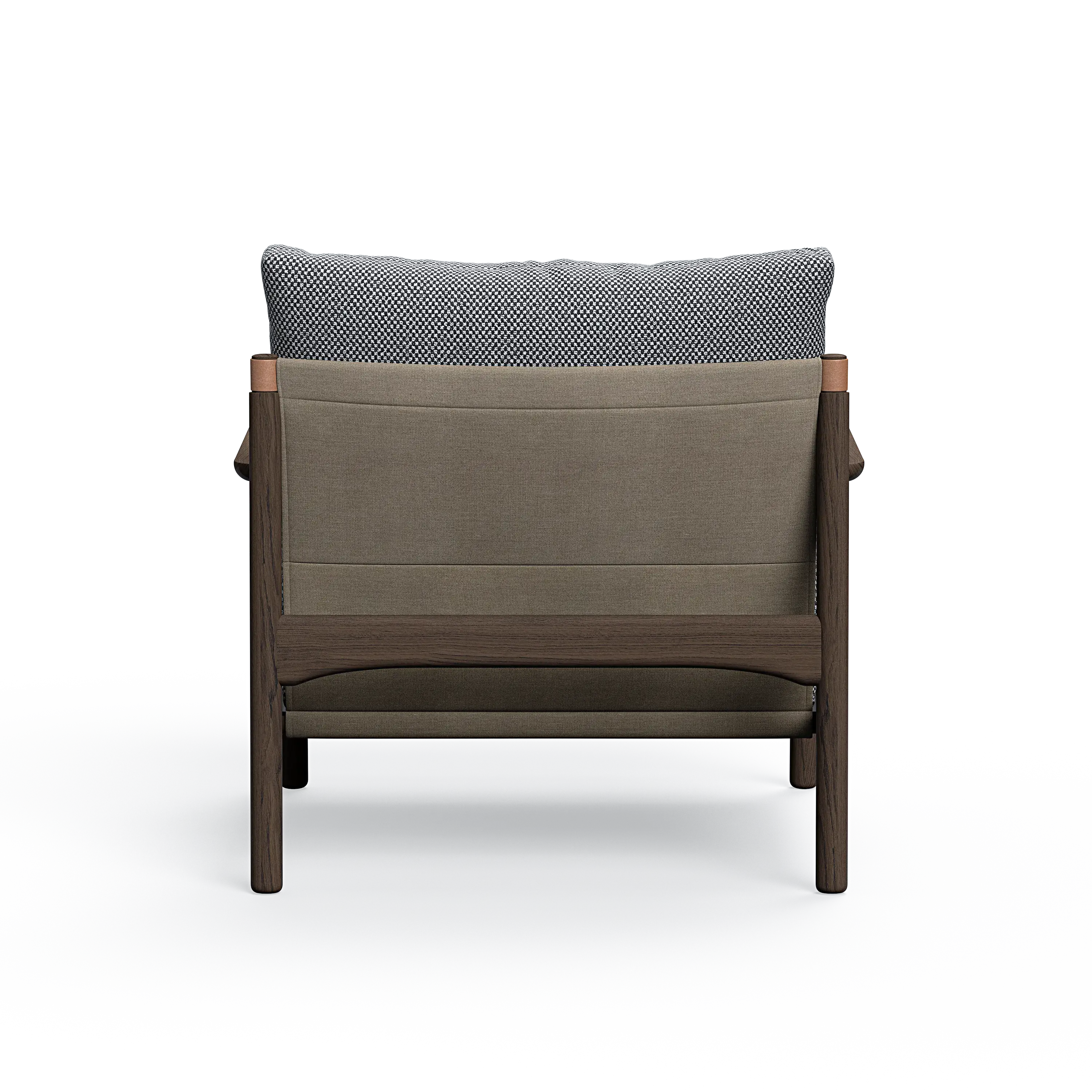 Das Erscheinungsbild beeindruckt durch ein sorgfältig gefertigtes Gestell aus massiver Eiche, das Eleganz wie Solidität ausstrahlt. Die breiten und bequemen Sitz- und Rückenkissen bestehen aus Leinenstoff, eine stille Hommage an vergangene Meisterwerke. Dieses Design verleiht dem Stuhl nicht nur einen haptischen Reiz, sondern verleiht dem Sessel auch außergewöhnlichen Sitzkomfort. Praktische Designdetails aus veganem Leder vollenden den Look.