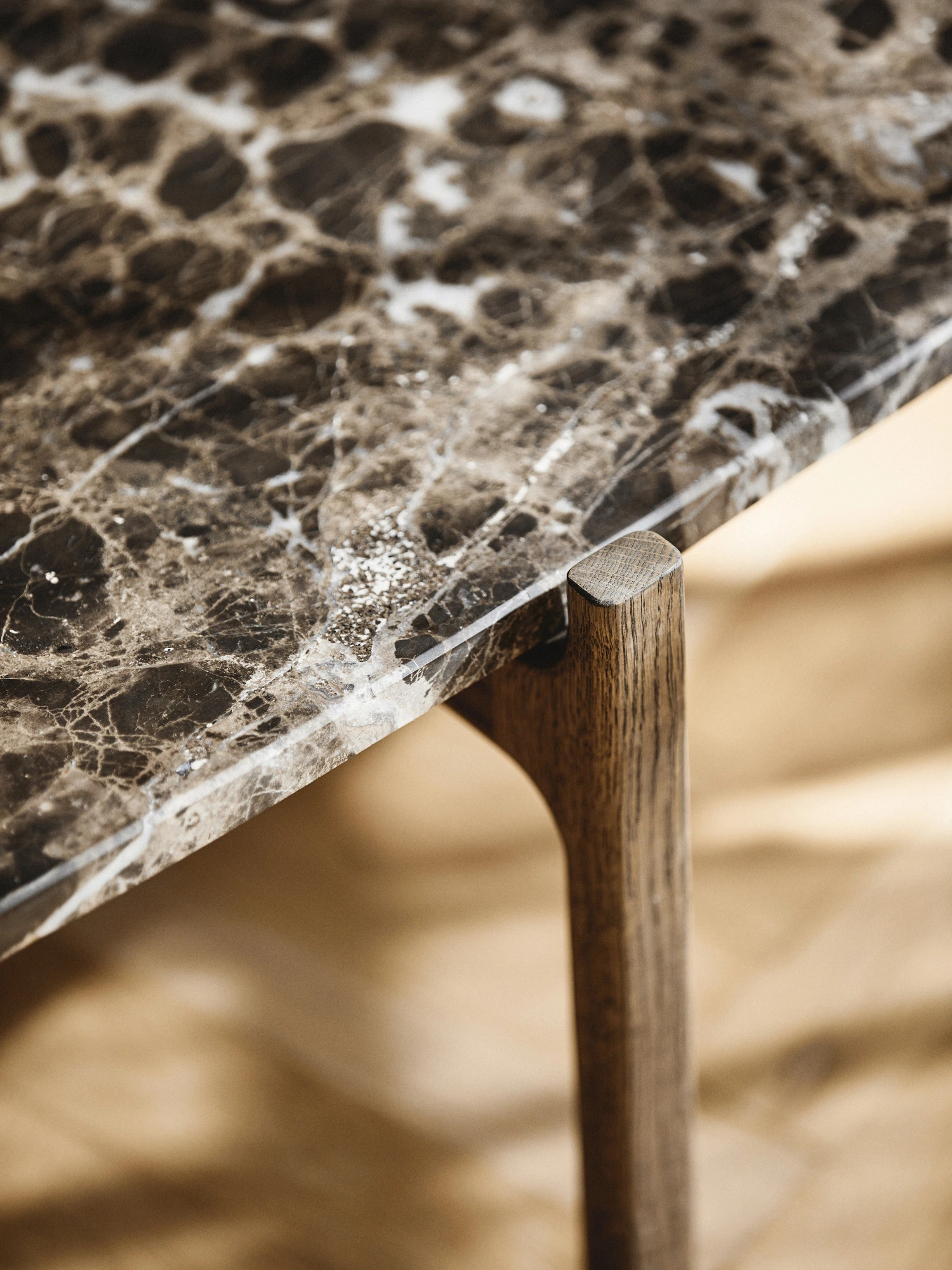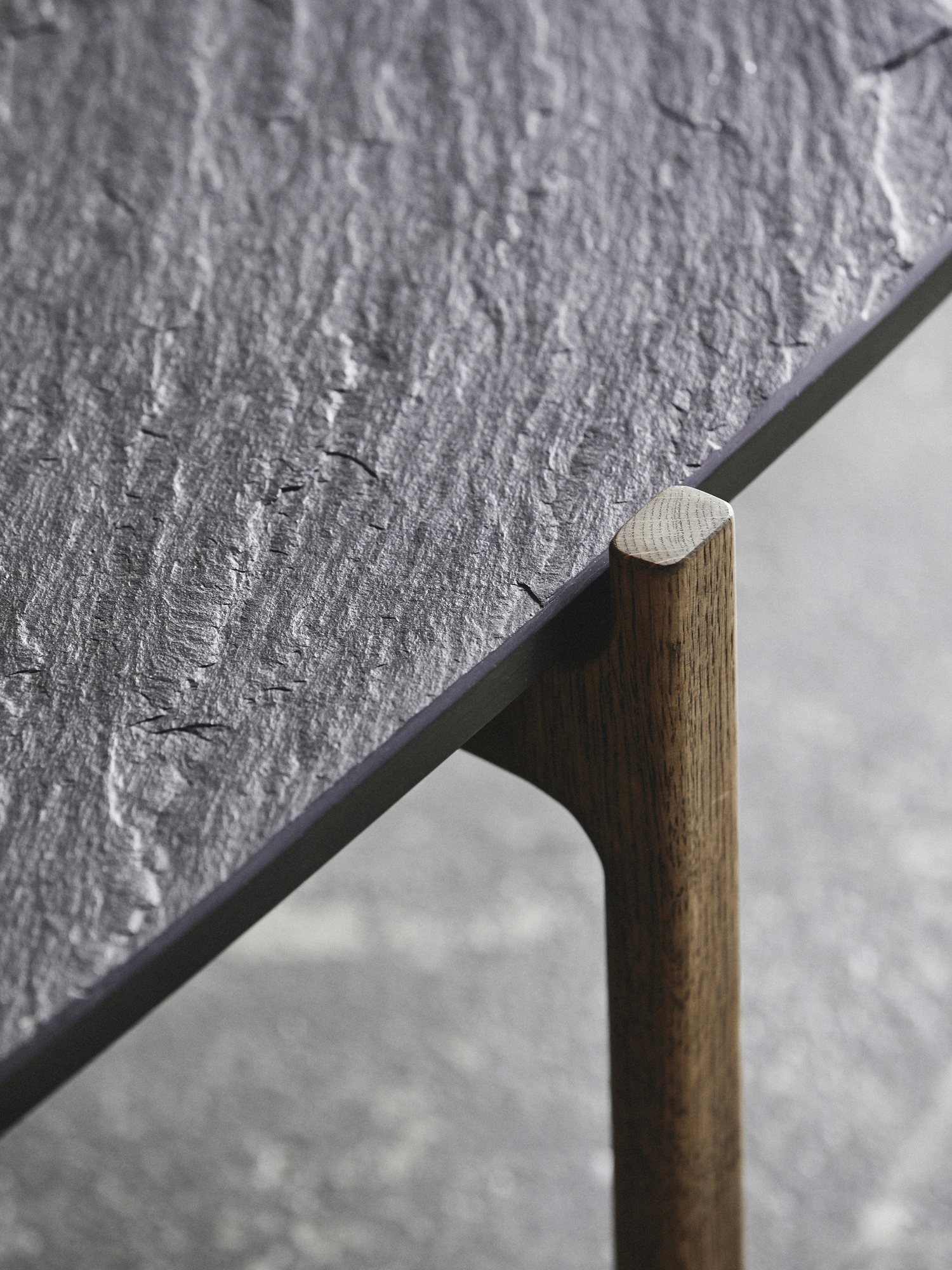 Der Tisch ist in verschiedenen Größen und mit Gestellen aus Metall sowie geölter und geräucherter Eiche erhältlich. Für die Tischplatte kannst du zwischen weißem und bräunlichem Marmor oder portugiesischem Schiefer wählen, der an eine vergangene Ära des dänischen Möbeldesigns und Inneneinrichtung erinnert.