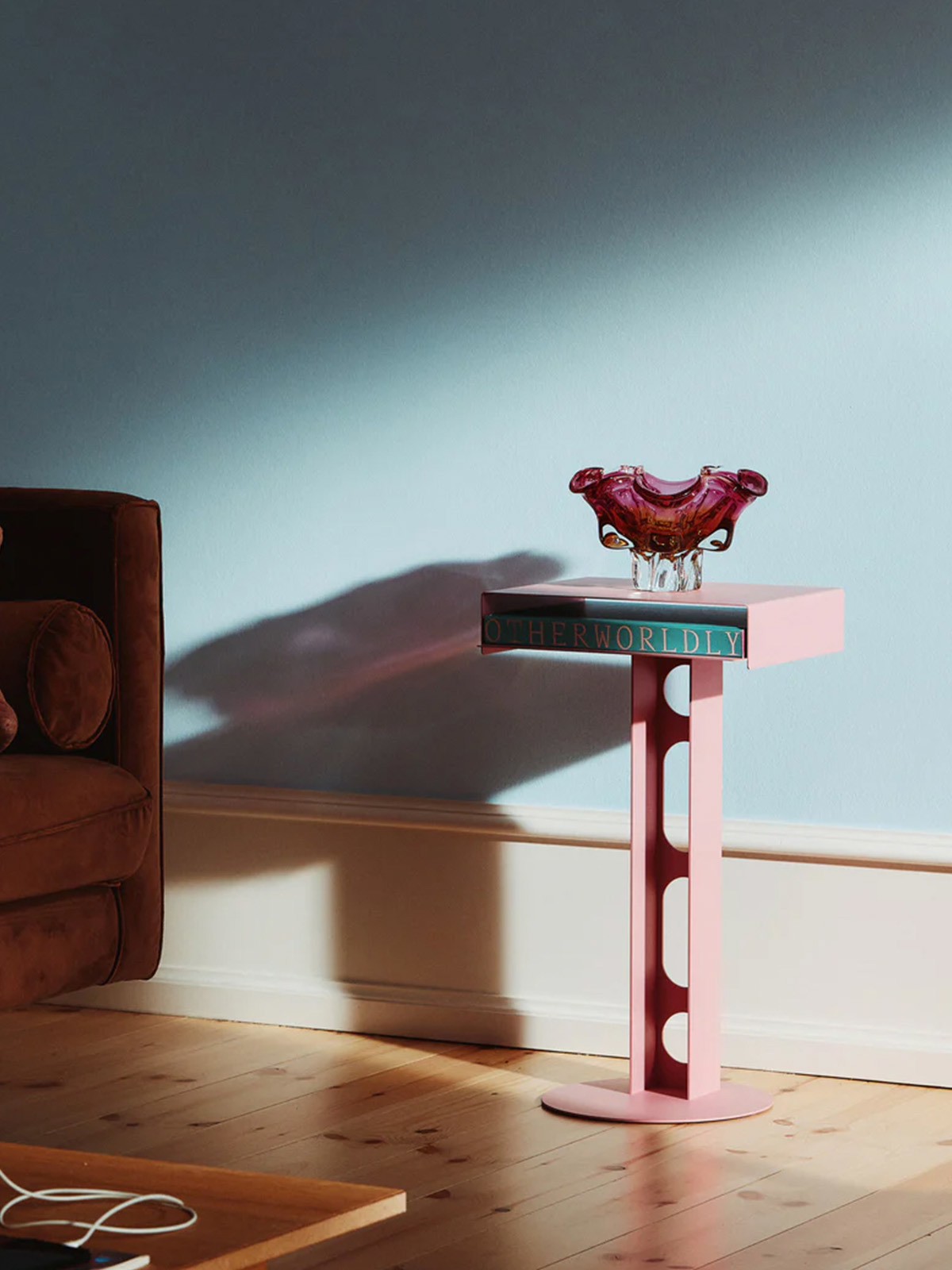 Bendy Tall Stand: A tall TV stand with slightly bent legs that give it a playful look. Available in colors like Charcoal and Mushroom.