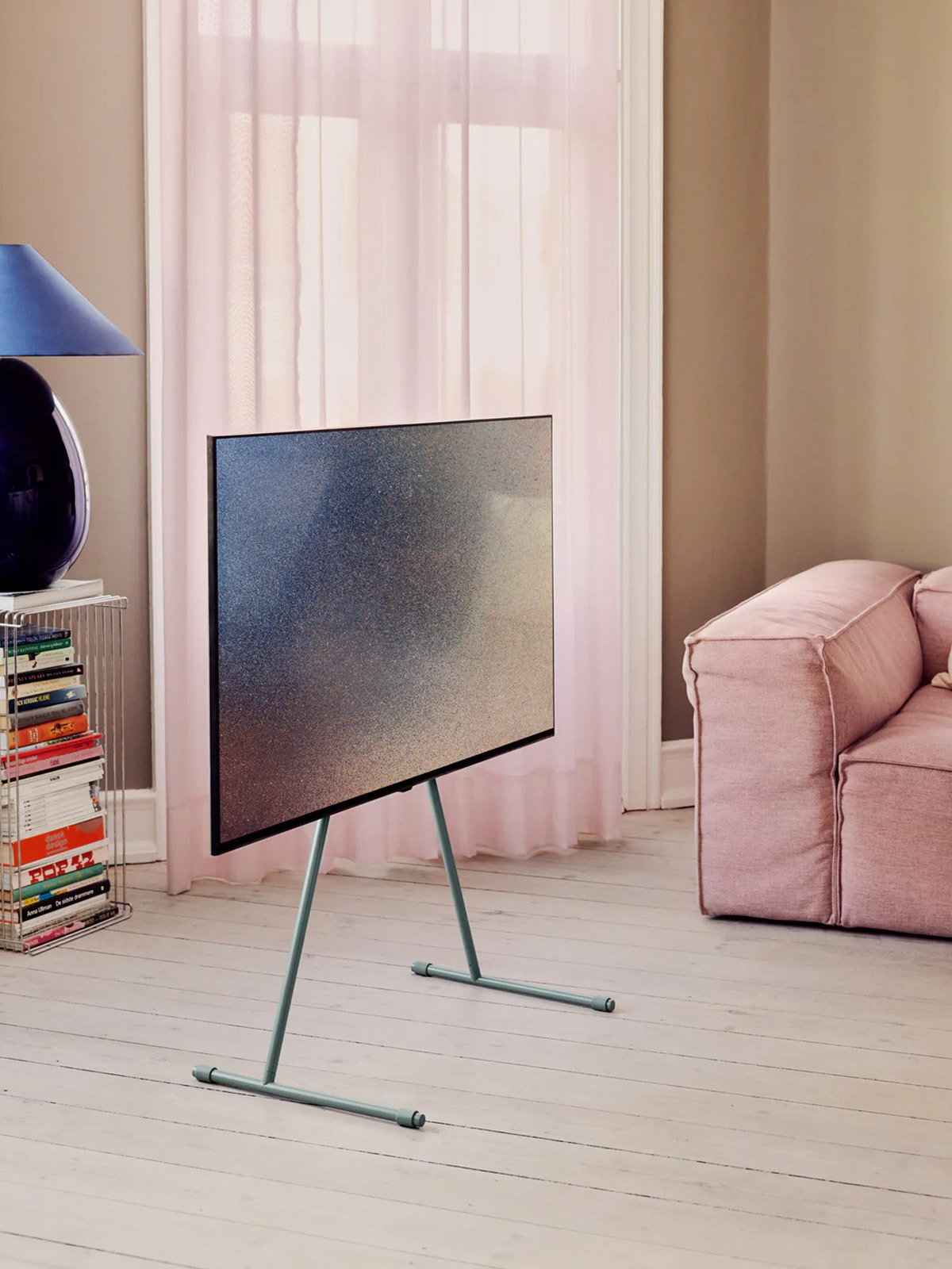 Bendy Tall Stand: A tall TV stand with slightly bent legs that give it a playful look. Available in colors like Charcoal and Mushroom.