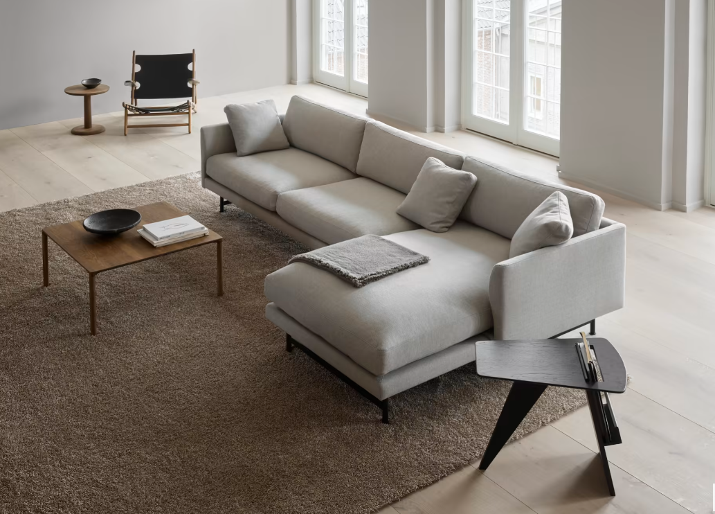 Calmo is a sofa concept designed for contemporary needs in both private and public spaces. The sofa’s proportions offer a roomy sense of cosiness that allows for work and conversation as well as relaxed comfort. Straight lines converge with discrete curved details in this Hugo Passos design which subtly breaks with the formality of the typical Scandinavian sofa.The placement of the chaise lounge can be changed on the spot using a standard hex key.