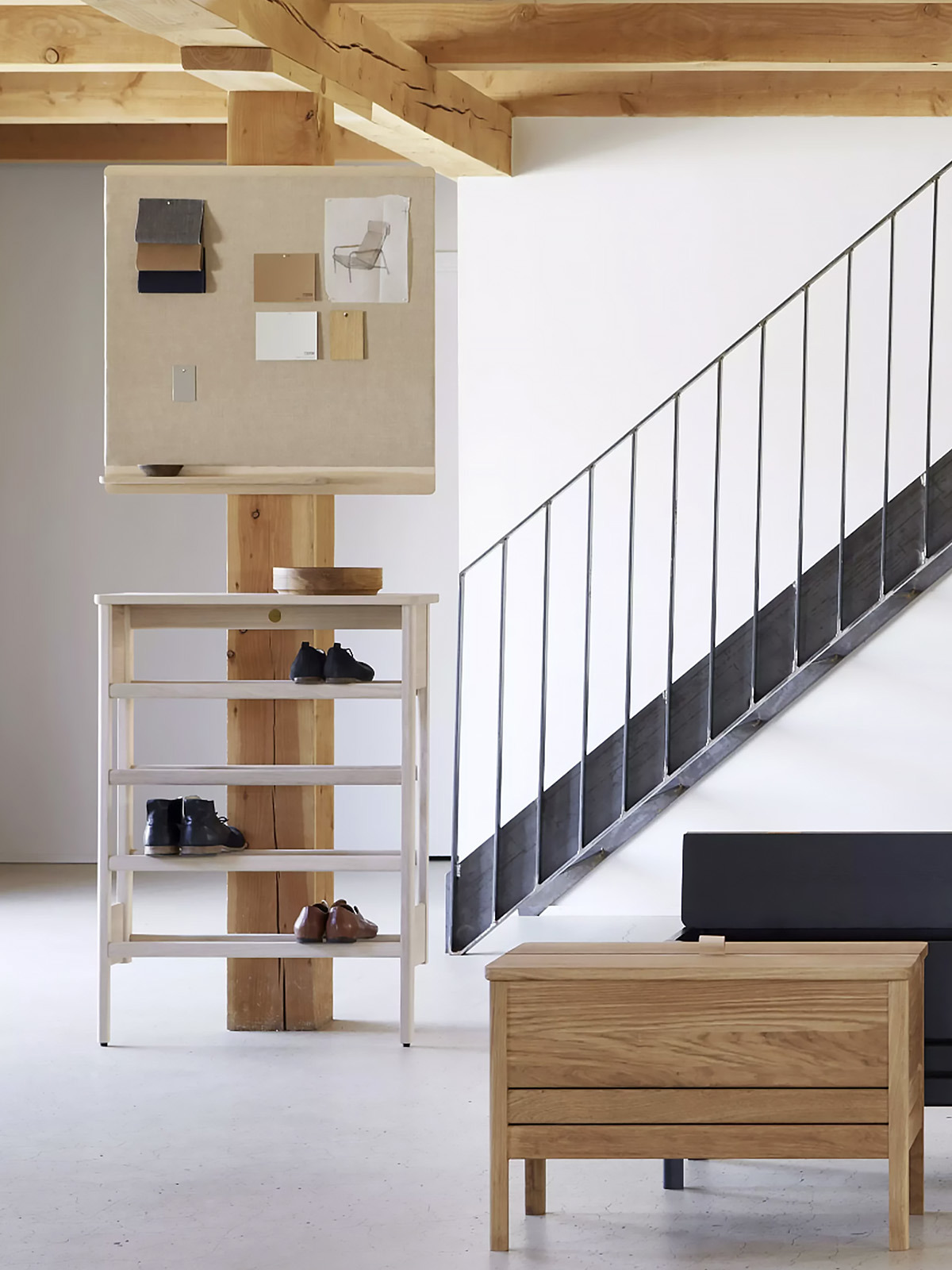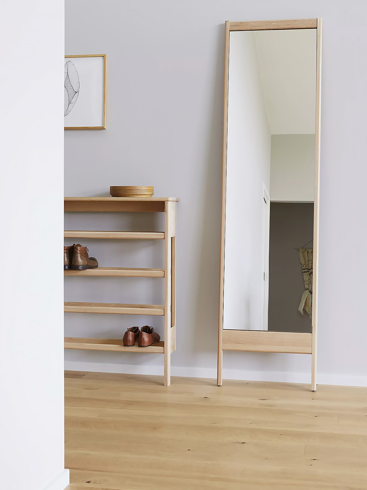 The A Line Shoe Rack is a small harmoniously designed combined shoe rack and console table that helps make the best use of the narrow space found in hallways, utility rooms or functional entrance halls. It is made of sustainable sourced oak of the highest quality and its contours are rounded carefully in line with artisan craft tradition. The large top shelf above the rack serves as a console table. Each shelf can accommodate one pair of shoes and four pairs of shoes in total. We recommend mounting the Shoe Rack to the wall with the metal brackets included. The shoe rack can however lean against the wall without mounting.