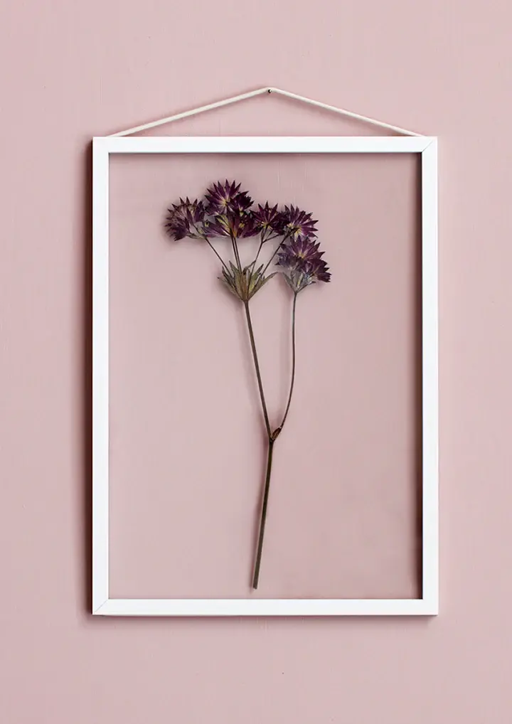 Frame consists of two pieces of acrylic glass, four lists, and a rubber band. The rubber band both holds the frame together and serves for hanging the frame on your wall.