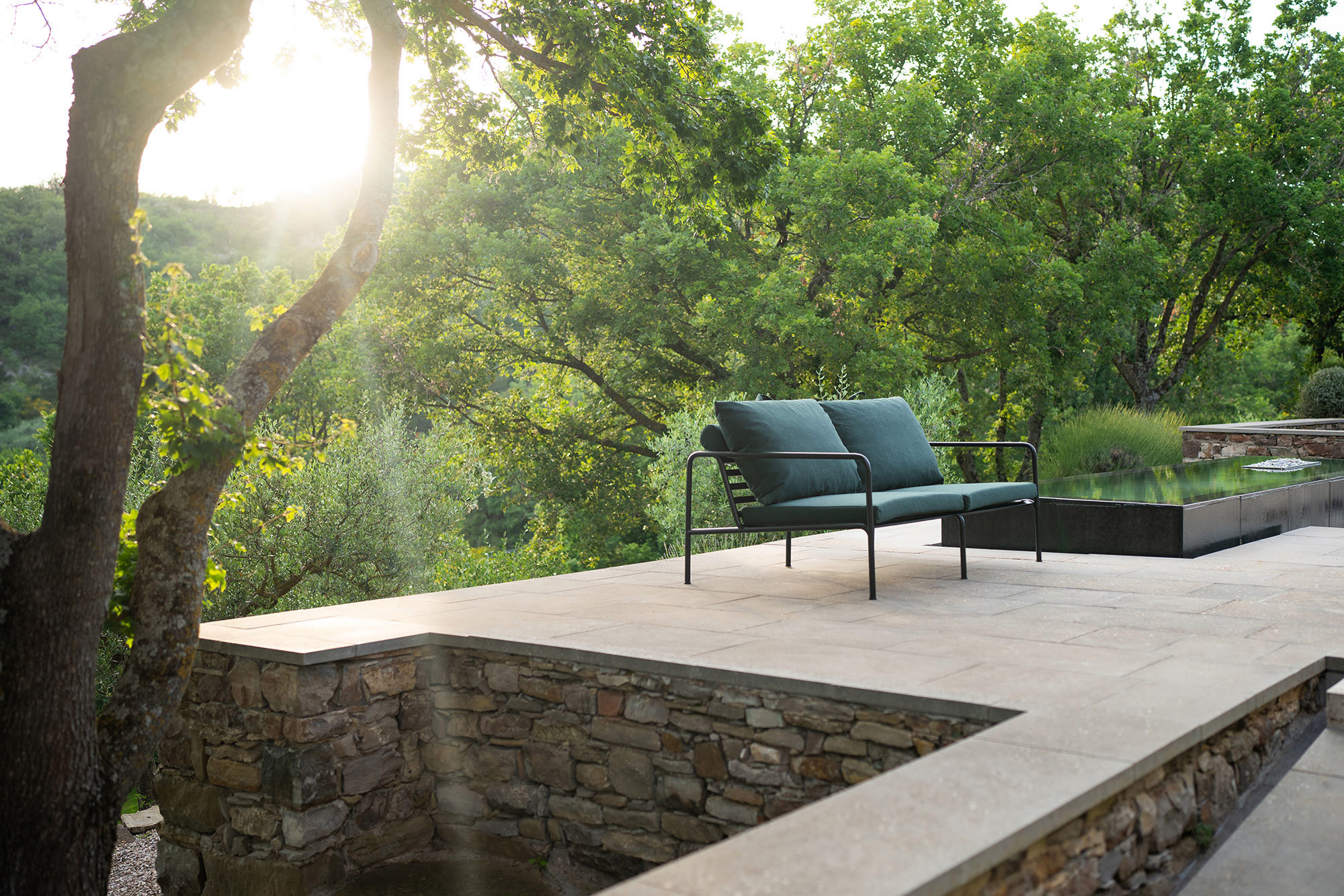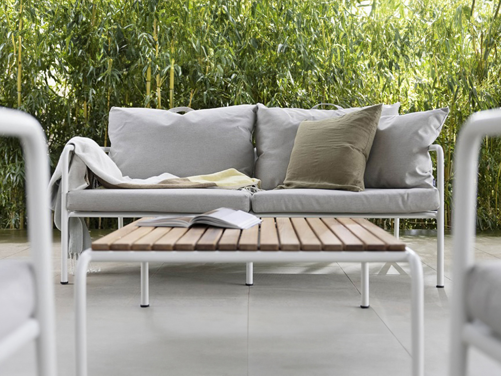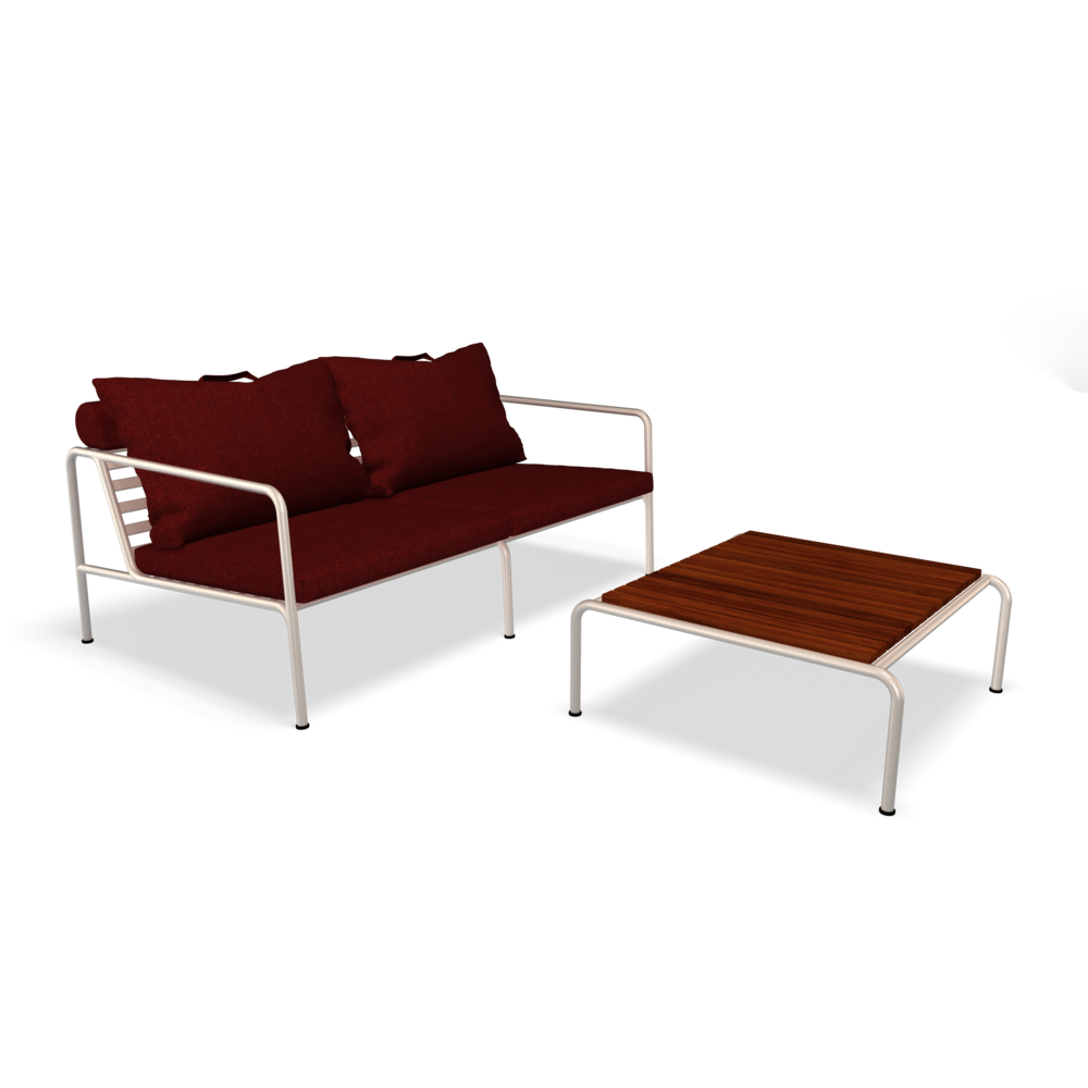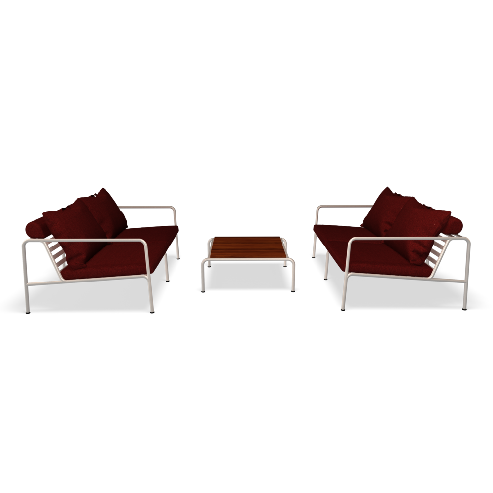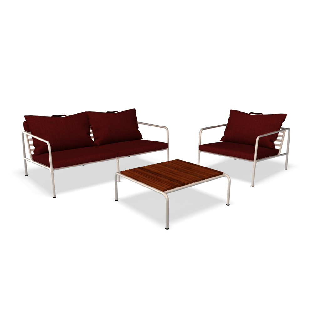 The AVON collection was designed with a focus on creating a lounge collection with a very light appearance and a low sleek profile while maintaining a high level of comfort. The simplicity of the frame, where low lines ensure, that the design always appears stylish, with and without cushions - summer and winter. The handle of the cushions is a statement., It also adds to the function of the product, making them easy to grab and store if needed. The cushions are made in Sunbrella Heritage fabric which contains 50% recycled acrylic. Colorful fiber ends from the process of recycling may appear in the weave and creates a unique and natural look.