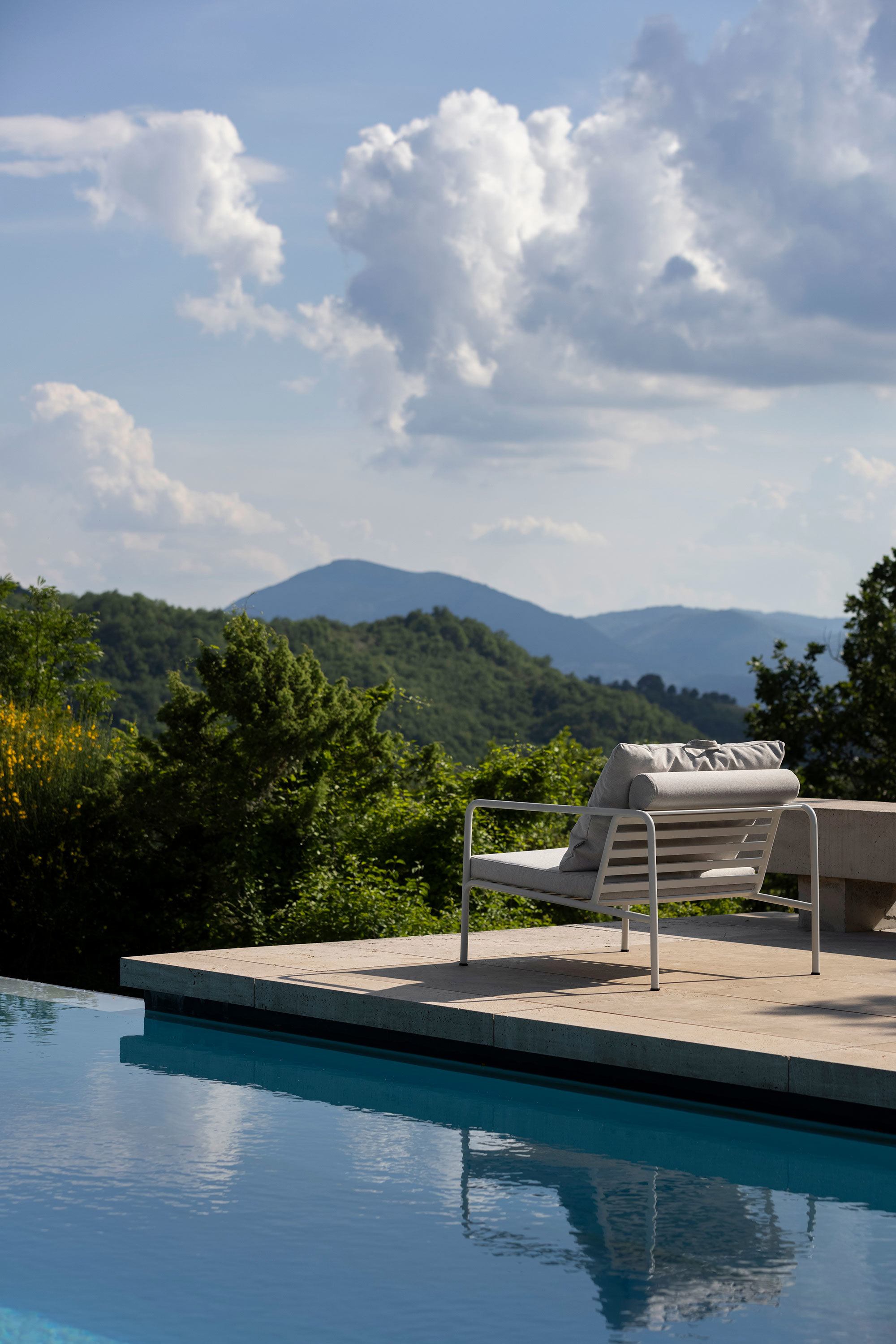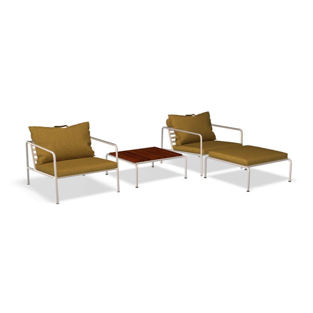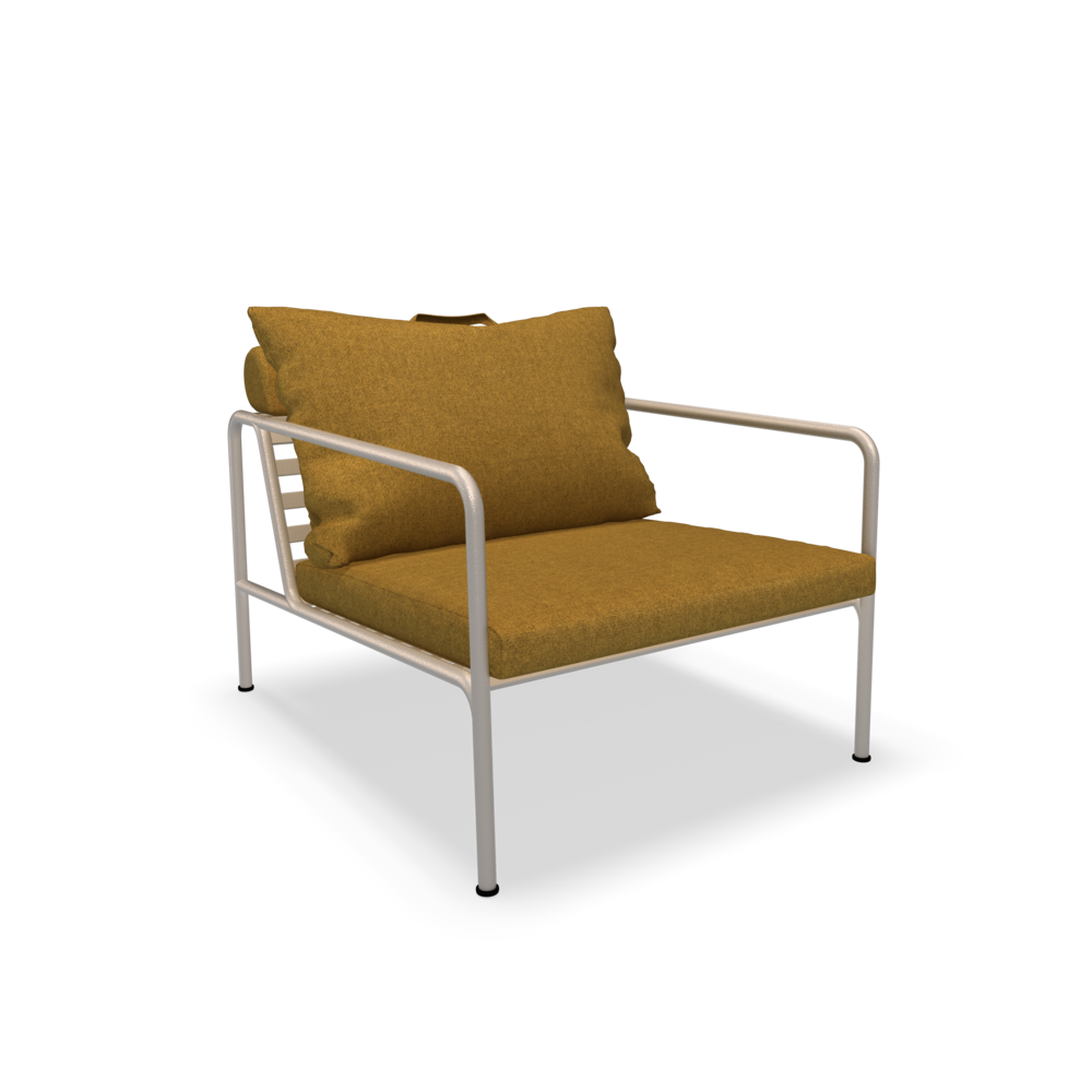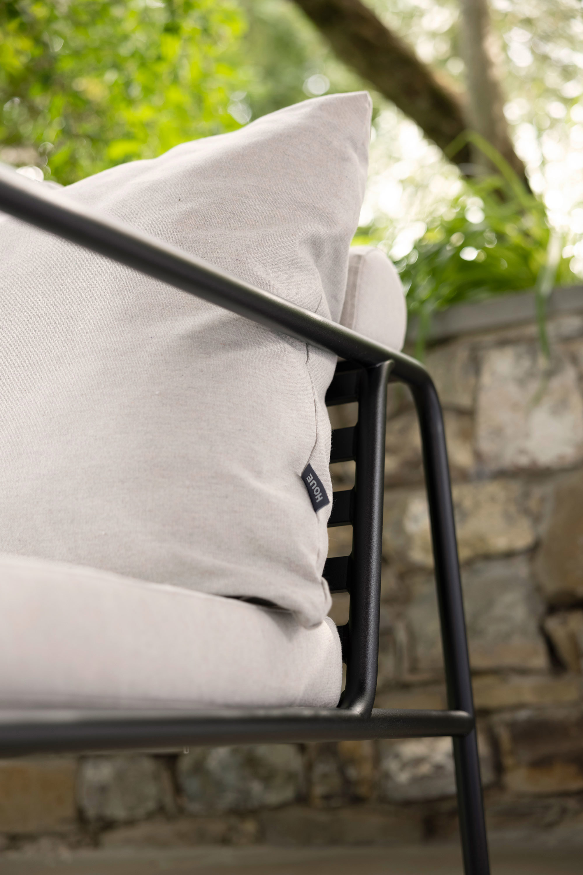 The AVON collection was designed with a focus on creating a lounge collection with a very light appearance and a low sleek profile while maintaining a high level of comfort. The simplicity of the frame, where low lines ensure, that the design always appears stylish, with and without cushions - summer and winter. The handle of the cushions is a statement., It also adds to the function of the product, making them easy to grab and store if needed. The cushions are made in Sunbrella Heritage fabric which contains 50% recycled acrylic. Colorful fiber ends from the process of recycling may appear in the weave and creates a unique and natural look.