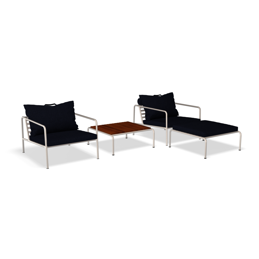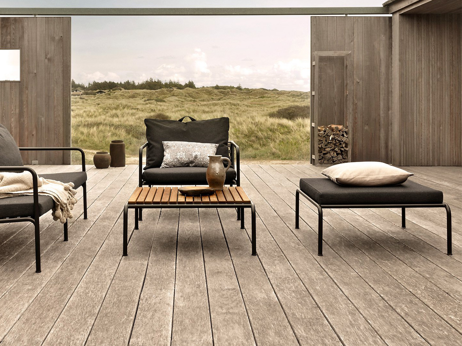 The AVON collection was designed with a focus on creating a lounge collection with a very light appearance and a low sleek profile while maintaining a high level of comfort. The simplicity of the frame, where low lines ensure, that the design always appears stylish, with and without cushions - summer and winter. The handle of the cushions is a statement., It also adds to the function of the product, making them easy to grab and store if needed. The cushions are made in Sunbrella Heritage fabric which contains 50% recycled acrylic. Colorful fiber ends from the process of recycling may appear in the weave and creates a unique and natural look.