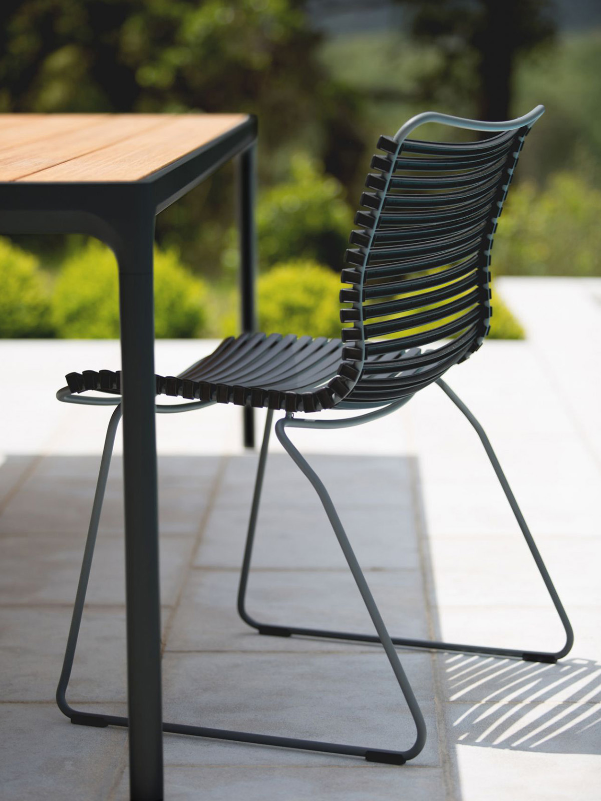 CLICK Dining chair. CLICK Dining chair is simple, honest and ergonomically well thought out. It is beautiful in its repetition around the table. The lamellas are composed with exactly the right strength and resilience to provide excellent cushion-free comfort. The lamellas can be CLICKed on and off - which makes it possible to modify the look of the chair simply by changing - or mixing the different lamella colors. CLICK Dining chair comes with or without Armrest in 13 colors. CLICK Dining chair is stackable.