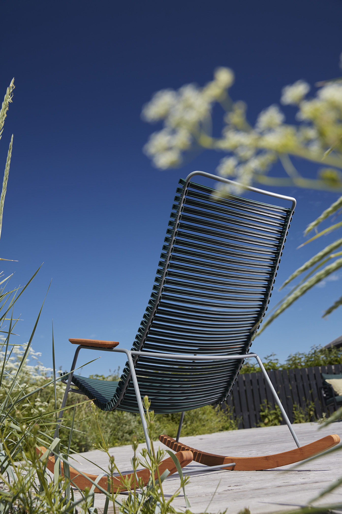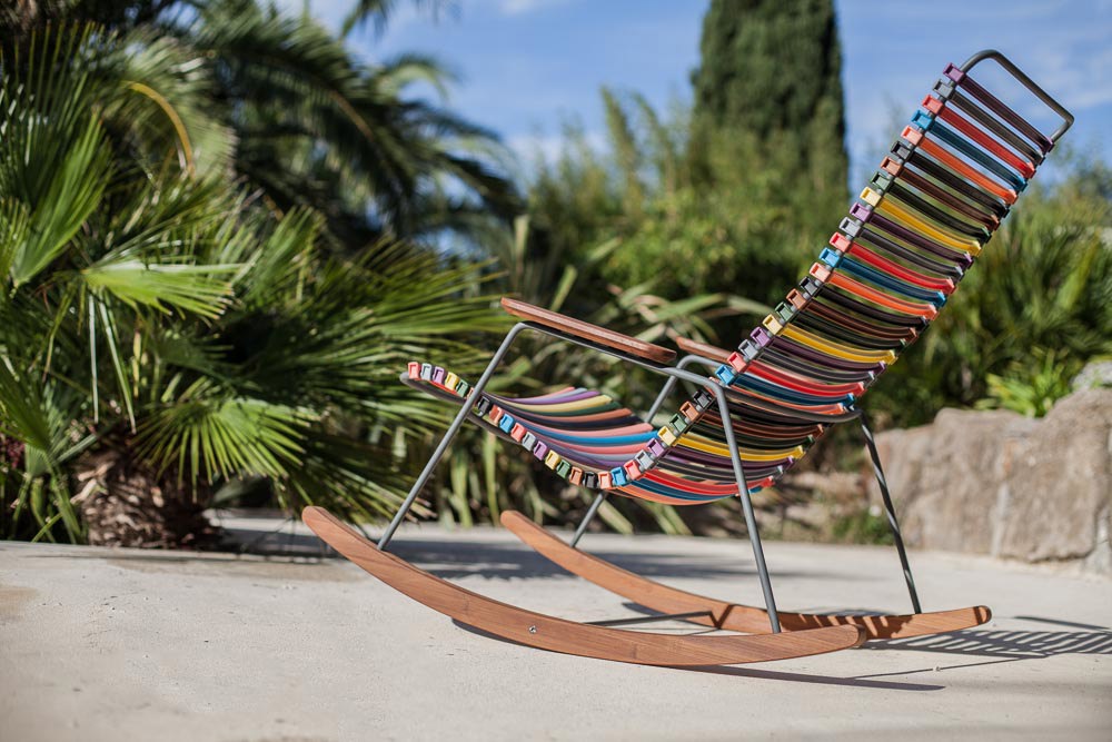 CLICK Rocking chair. Most people like to sit in a Rocking chair - adults and children. The body will rest in the dynamic rocking movements - and you can only agree that this rocking chair is equal nice comfort at all levels. For outdoor and for indoor. The lamellas are composed with exactly the right strength and resilience to provide excellent cushion-free comfort. The lamellas can be CLICKed on and off - which makes it possible to modify the look of the chair simply by changing - or mixing the different lamella colors. CLICK Rocking chair comes in 13 colors.