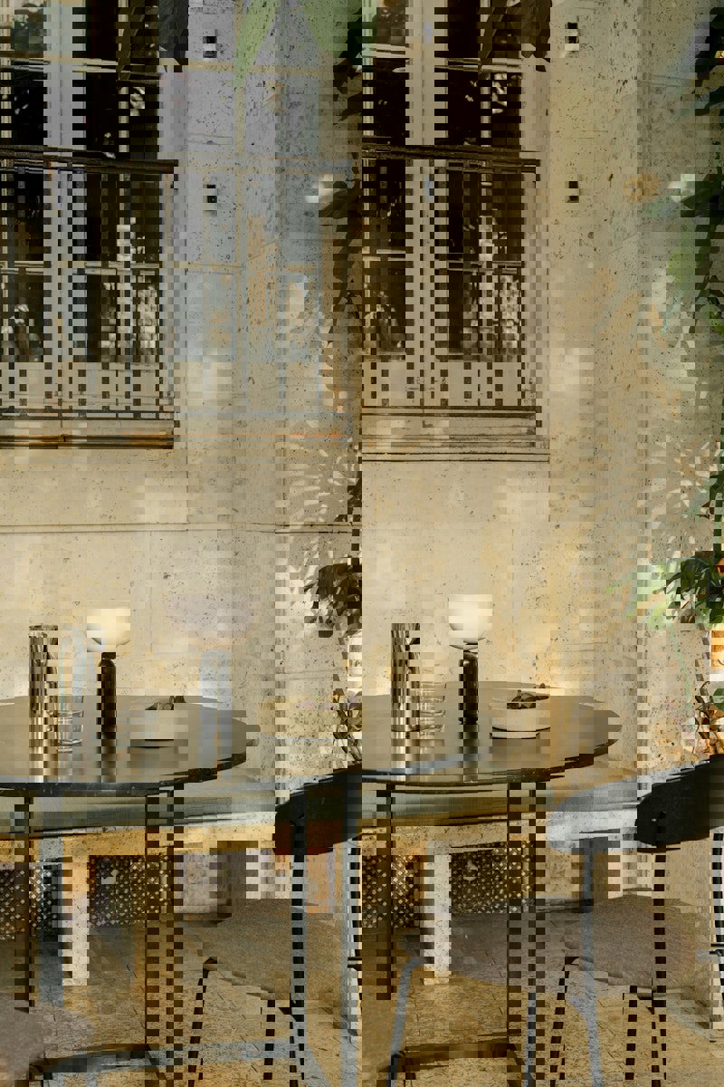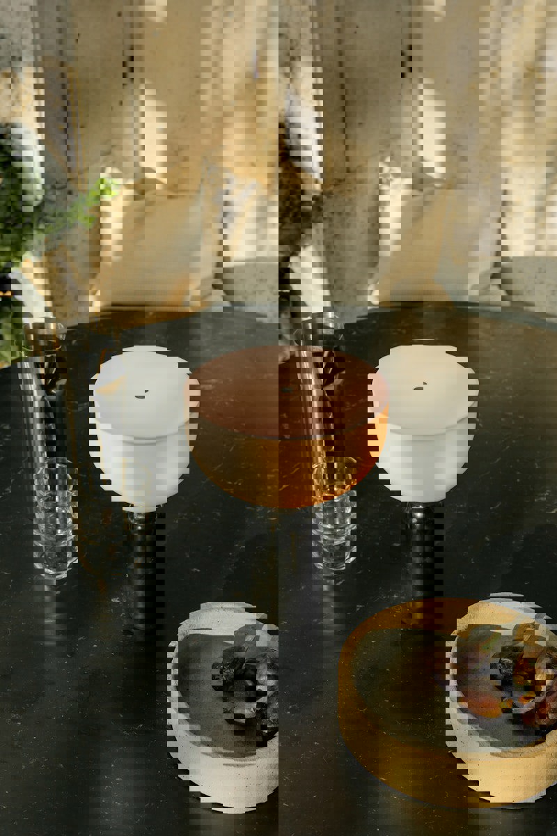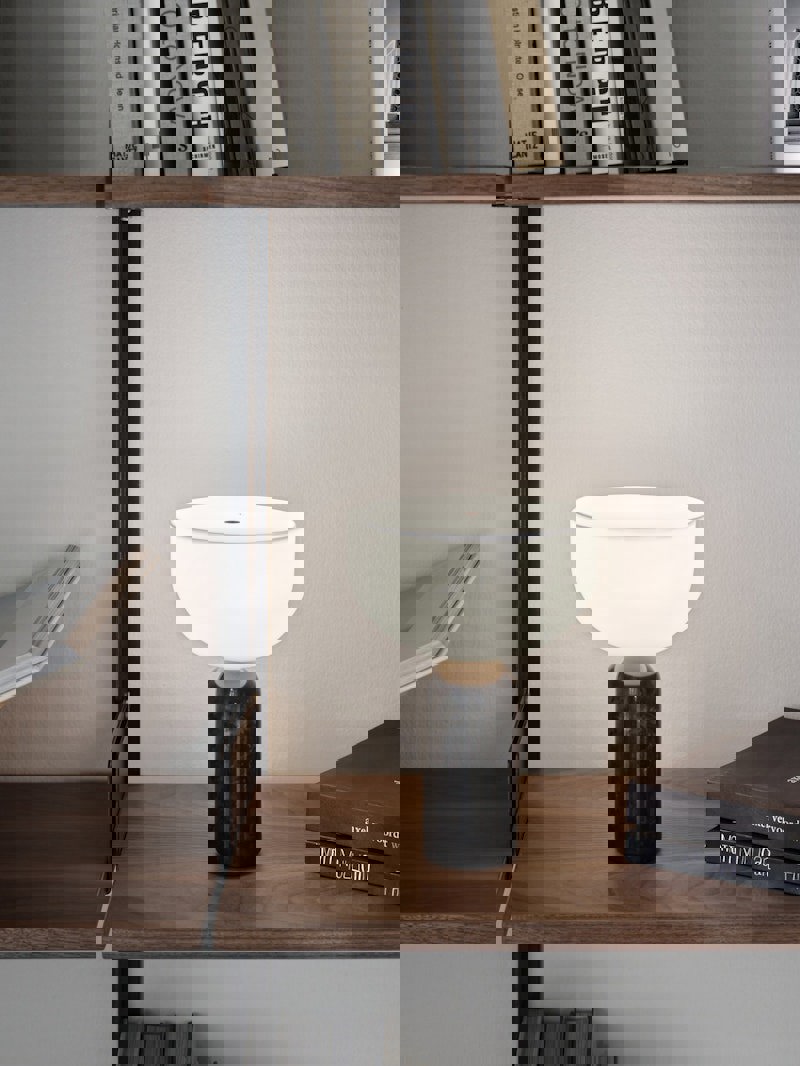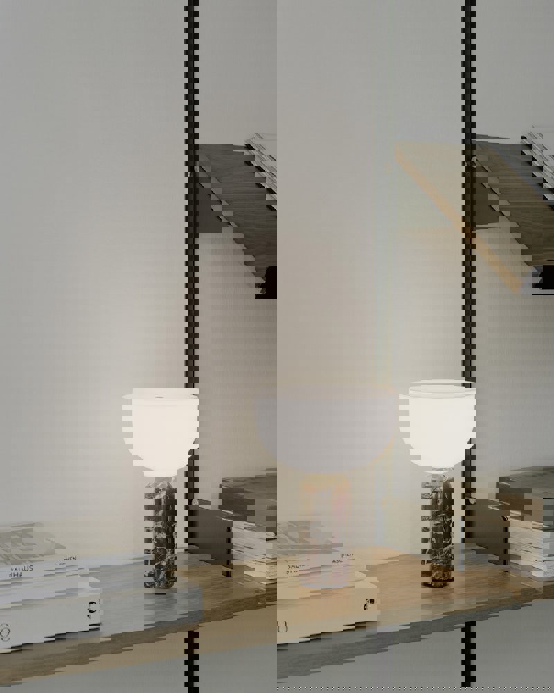 Balancing bold forms, the Kizu Table Lamp intrigues the eye with its sculptural composition, and this portable version of the lamp is no exception. Materials and expression are as we know them, but this cordless, smaller size is easy to move around where light is needed. With marble as the bearing element, the lamp obtains natural stability and the polished stone feels comfortable to the touch. As the light spreads from the entire upper part of the lamp, the small table lamp offers a high light output. A turned countersunk metal circle on the top of the lamp adds a refined detail to the design, and by tapping gently on the circle, the light can be dimmed to three different levels. The Kizu Table Lamp Portable has a battery life of 10 hours at a light setting of 100% and is charged with a USB-C cable.