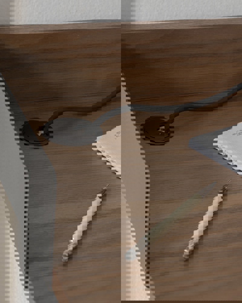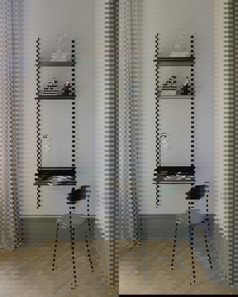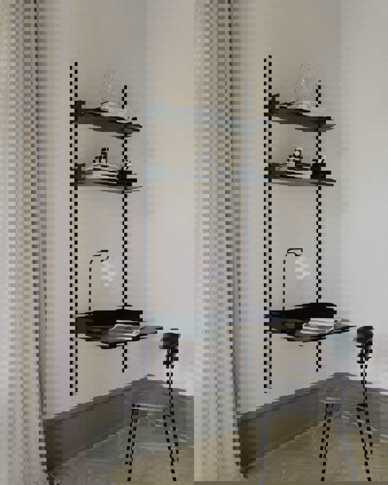 The New Works Desk element is ideal for creating a nook for work, homework, drawing or other creative pursuits, wherever you may need it. Use the desk in a single wall shelf unit or include it in a larger shelf with numerous units, for example in a living room or home library. The New Works Desk follows the design traits of the New Works Standard Shelf with its extended metal supports framing the desk. It features an outlet for cables, which holds them neatly in place and keeps their technical expression away from your home environment.