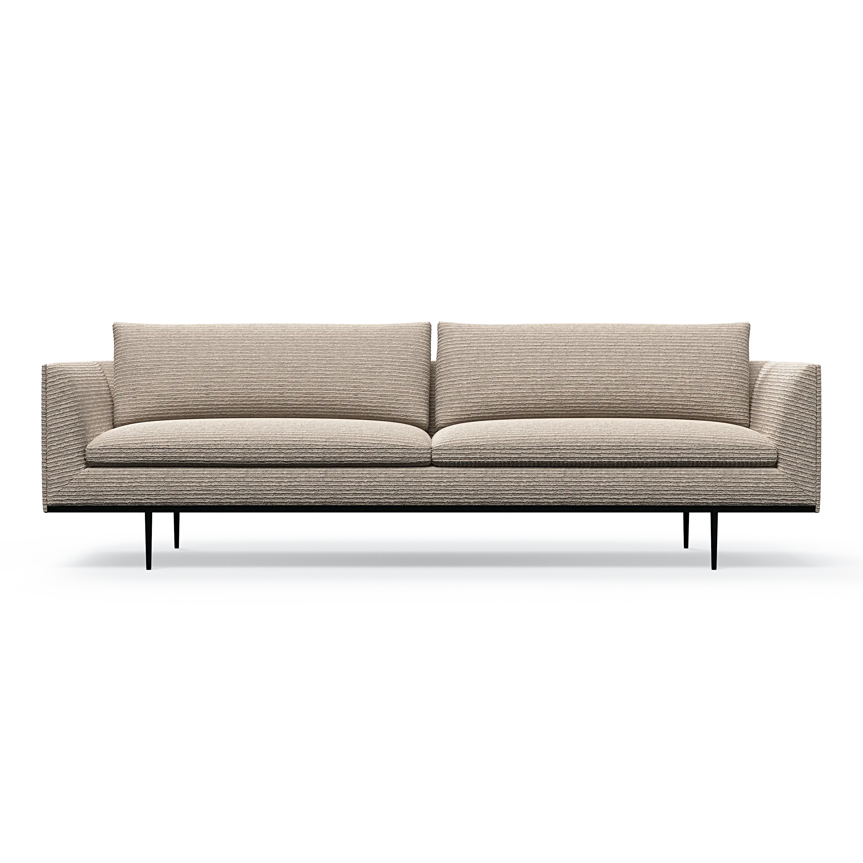 Headland is characterized by its partially exposed steel frame, slender legs, and slim base, radiating perfect balance and allowing space for both air and light to flow beneath the sofa.