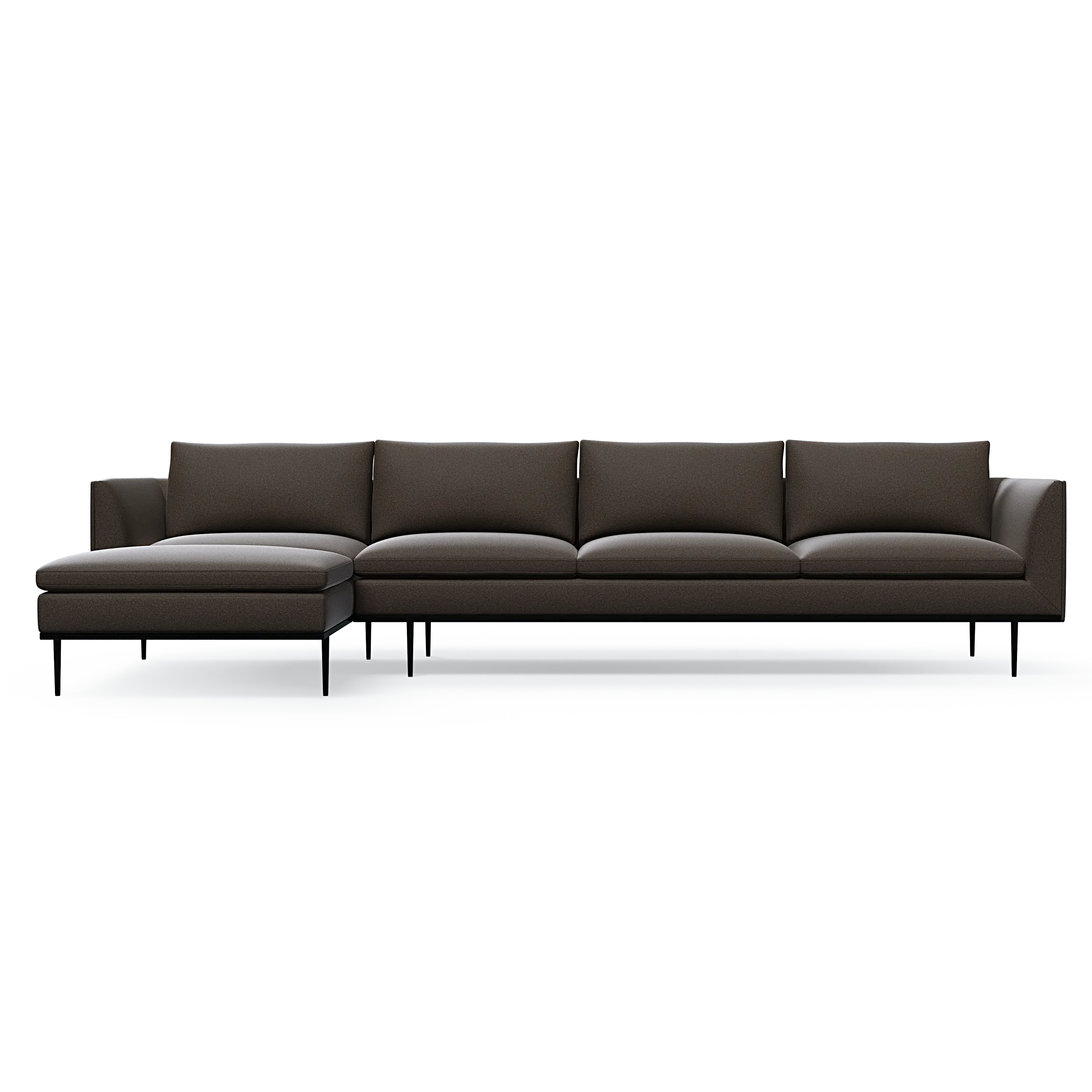 Headland is characterized by its partially exposed steel frame, slender legs, and slim base, radiating perfect balance and allowing space for both air and light to flow beneath the sofa.