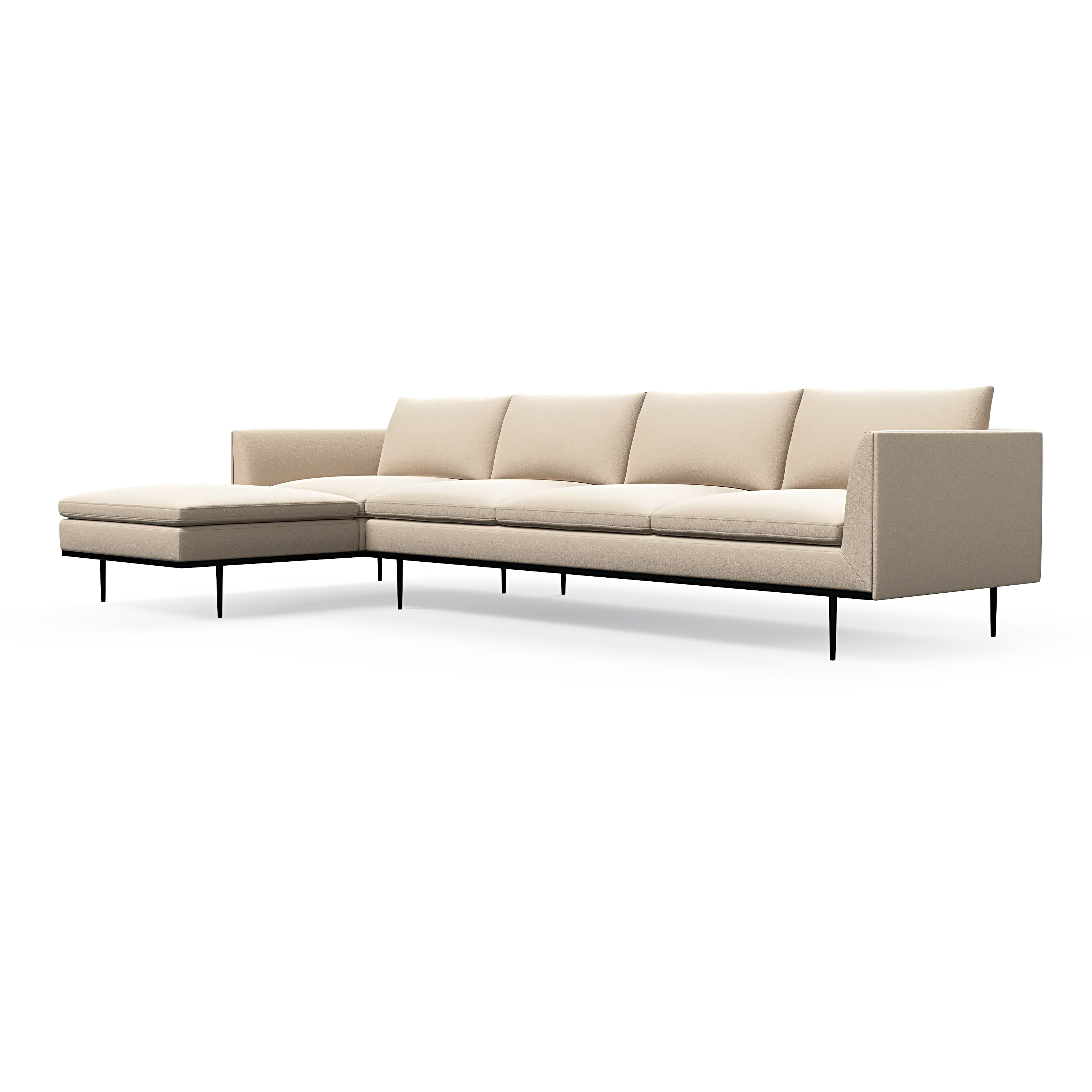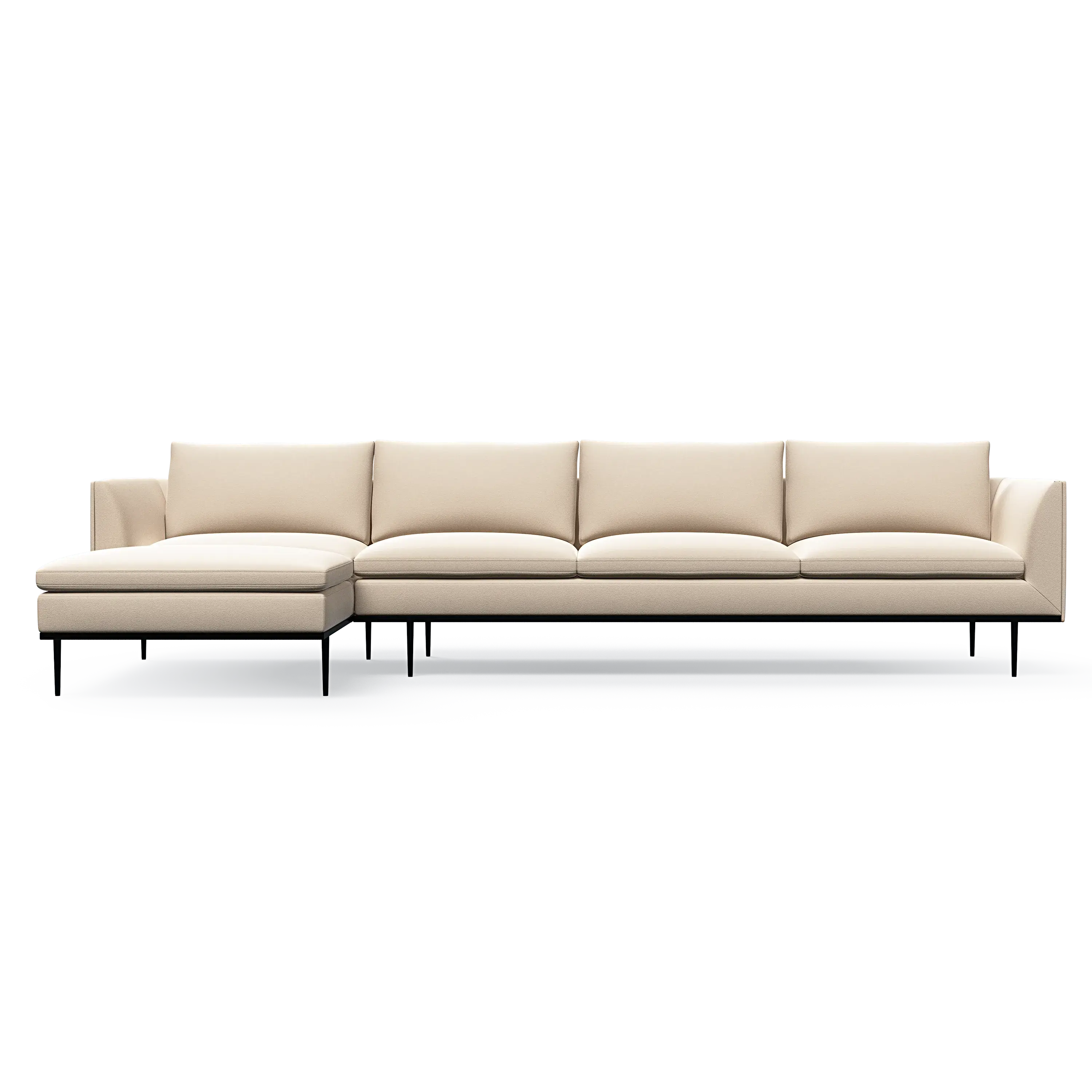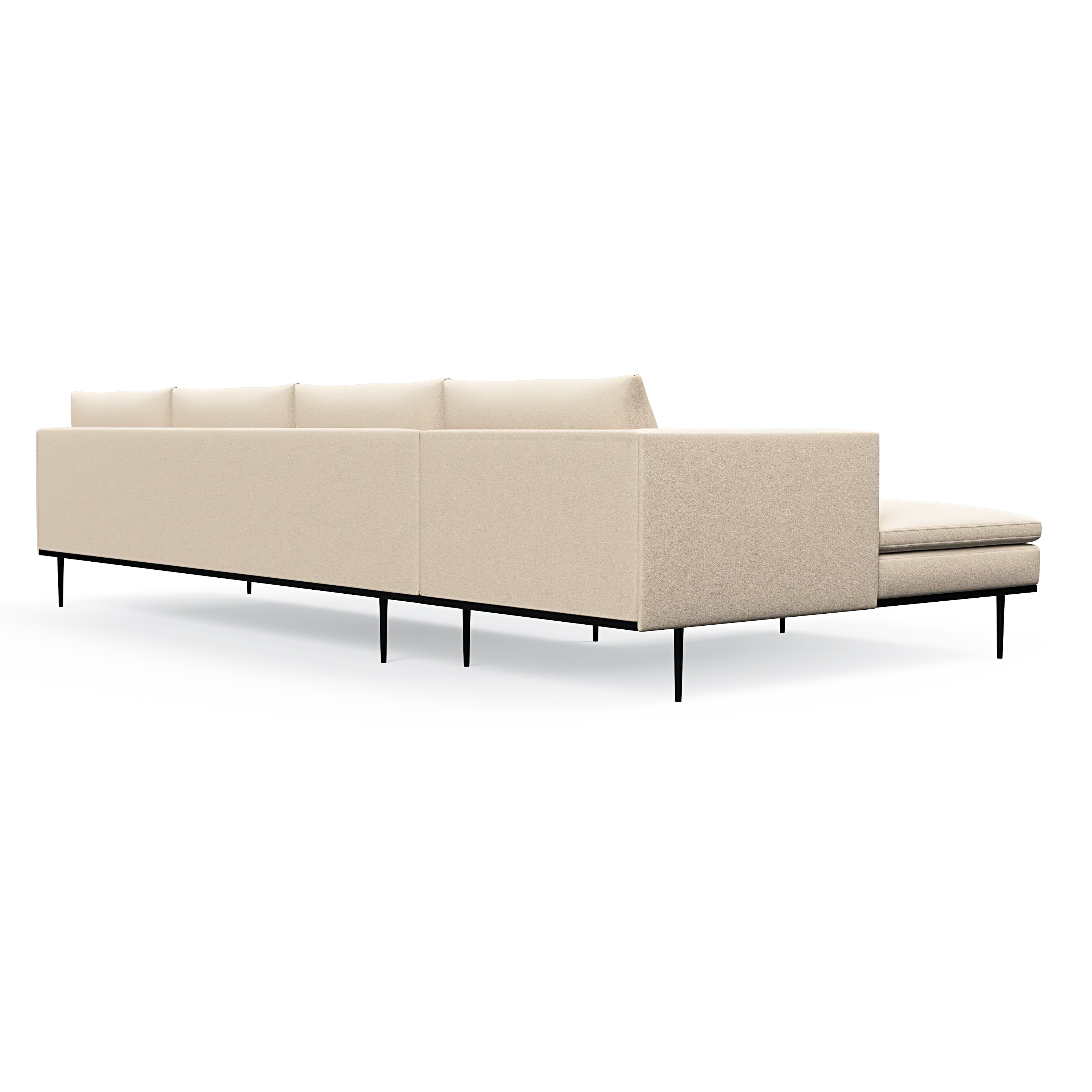 Headland is characterized by its partially exposed steel frame, slender legs, and slim base, radiating perfect balance and allowing space for both air and light to flow beneath the sofa.