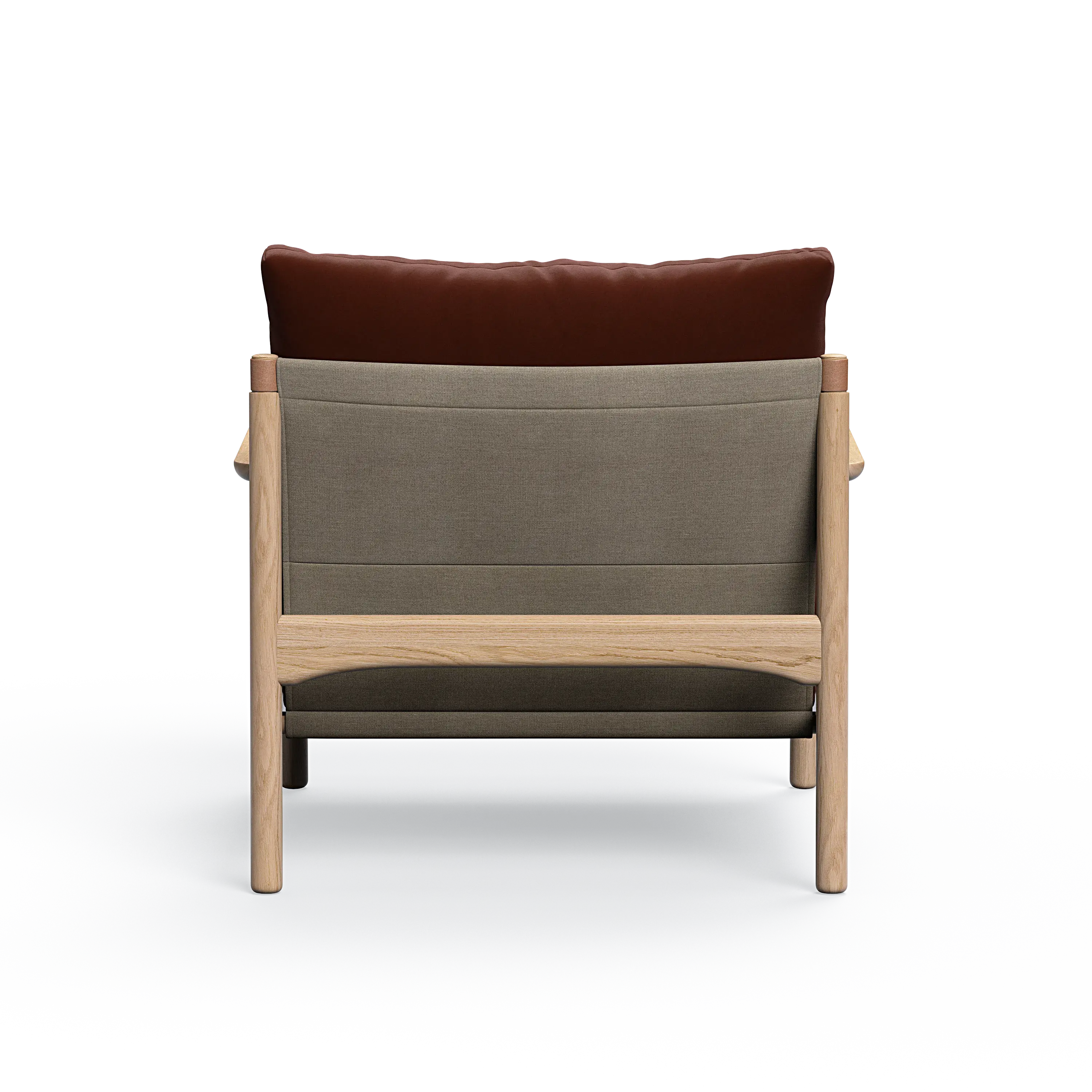 The expression is carried by the exquisitely executed solid oak frame, exuding both elegance and solidity. The thick and comfortable seat and back cushions rest on canvas-made belts, a subtle homage to past masterpieces. This construction not only adds a tactile allure but also guarantees exceptionally comfortable seating. Functional design details executed in vegan leather complete the expression.