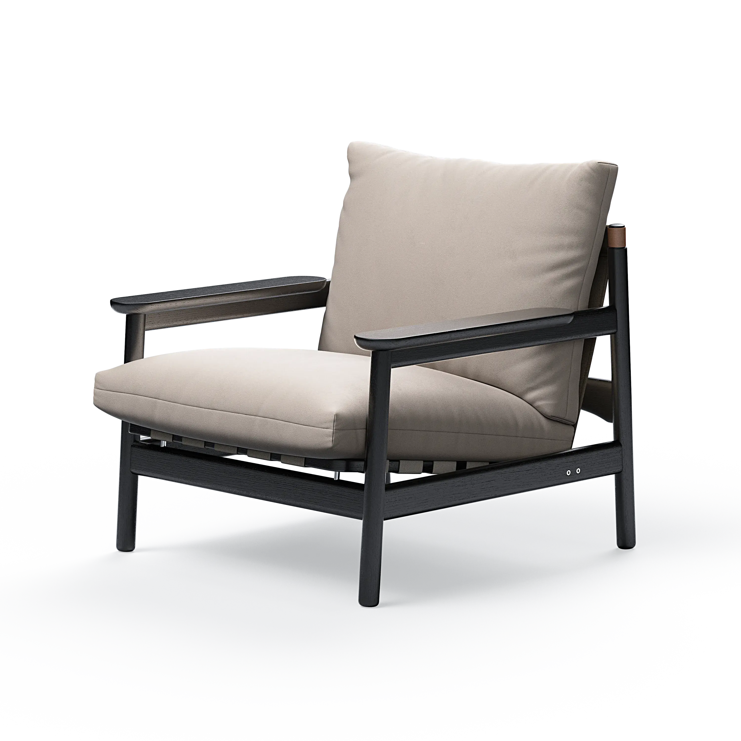 The expression is carried by the exquisitely executed solid oak frame, exuding both elegance and solidity. The thick and comfortable seat and back cushions rest on canvas-made belts, a subtle homage to past masterpieces. This construction not only adds a tactile allure but also guarantees exceptionally comfortable seating. Functional design details executed in vegan leather complete the expression.