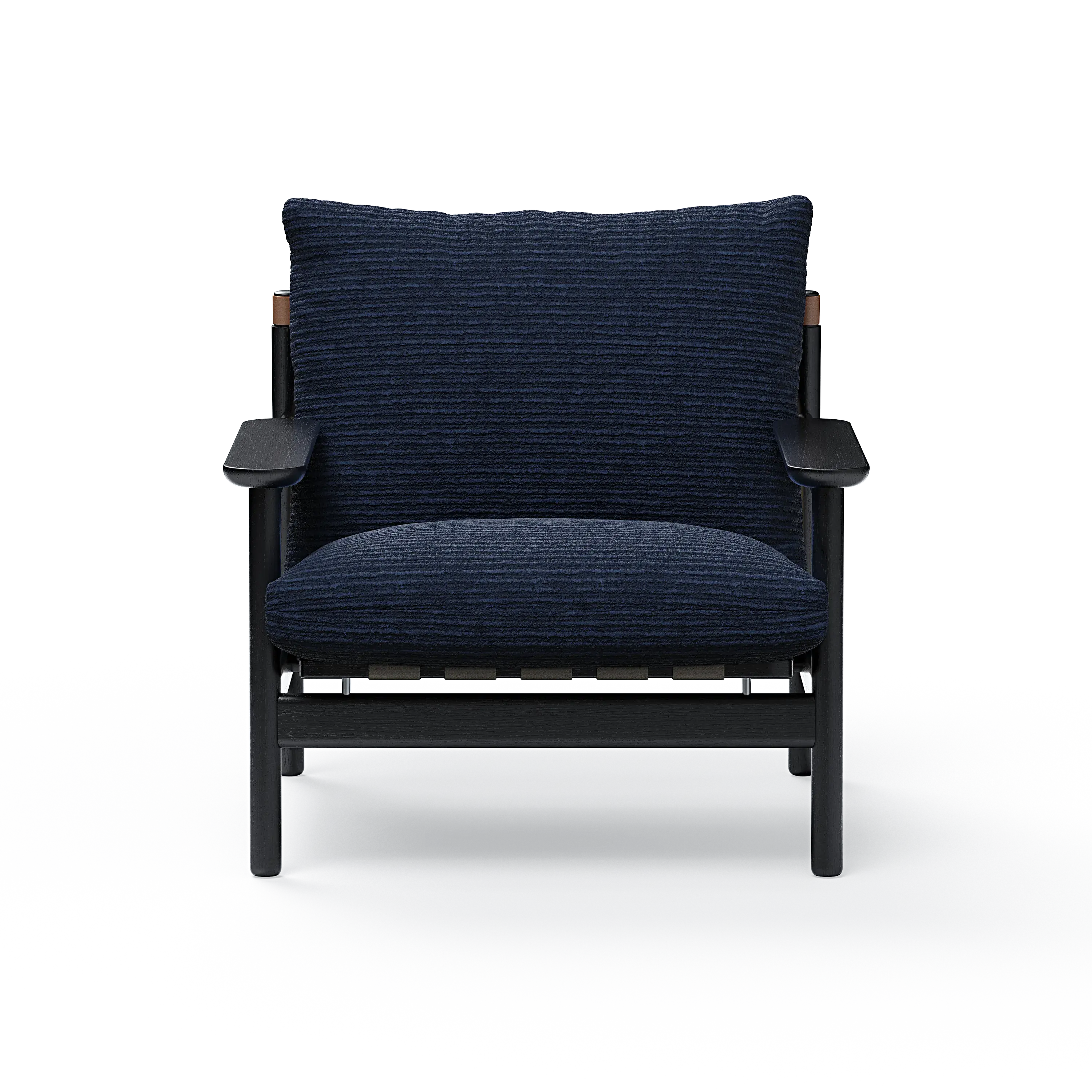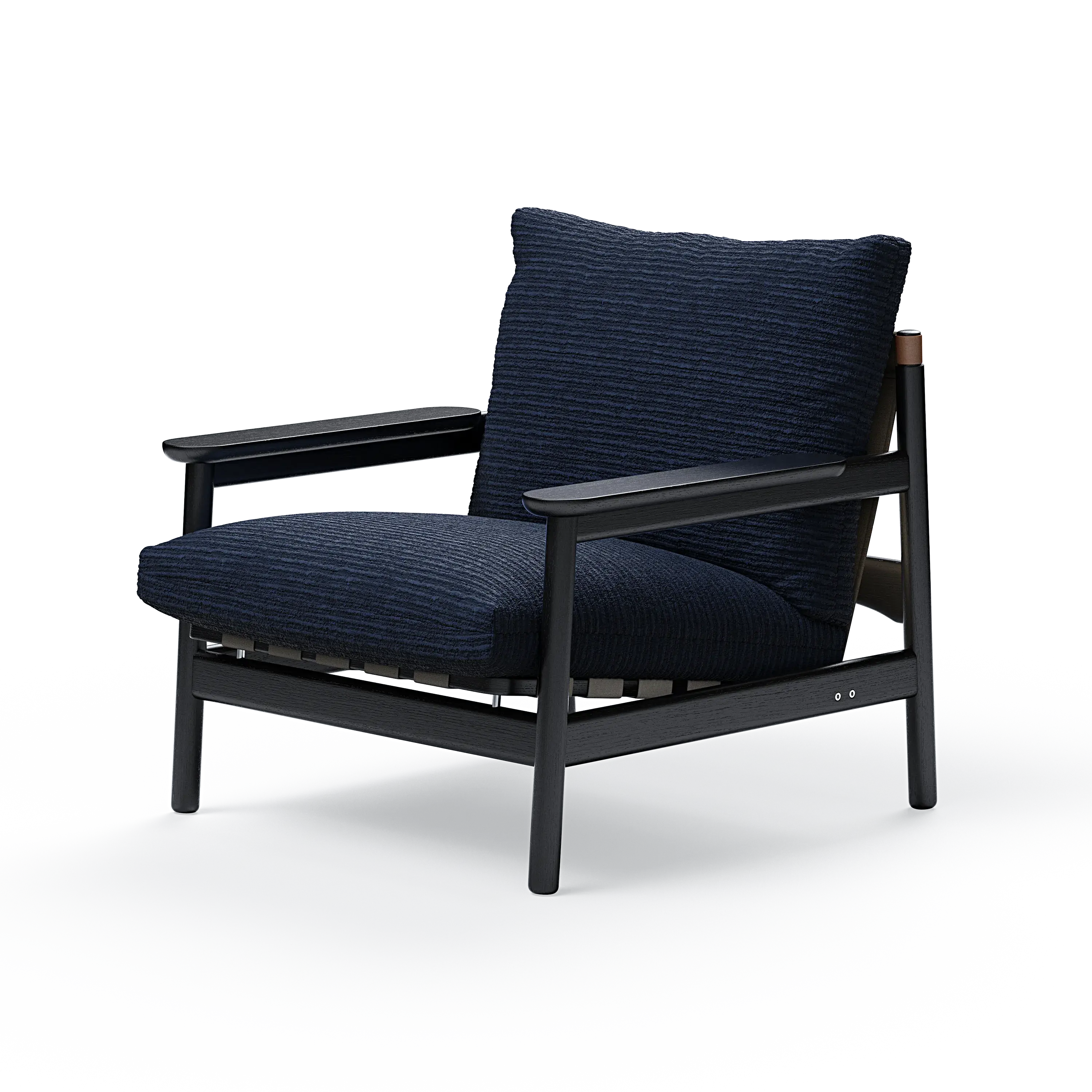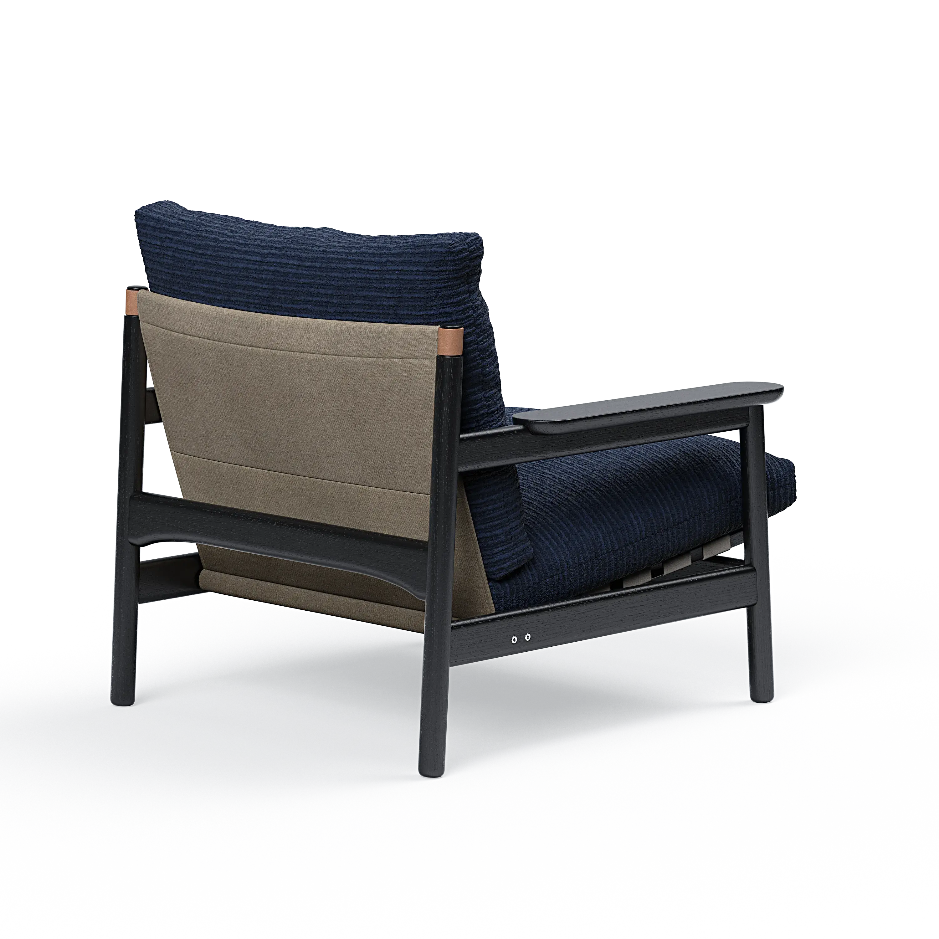 The expression is carried by the exquisitely executed solid oak frame, exuding both elegance and solidity. The thick and comfortable seat and back cushions rest on canvas-made belts, a subtle homage to past masterpieces. This construction not only adds a tactile allure but also guarantees exceptionally comfortable seating. Functional design details executed in vegan leather complete the expression.
